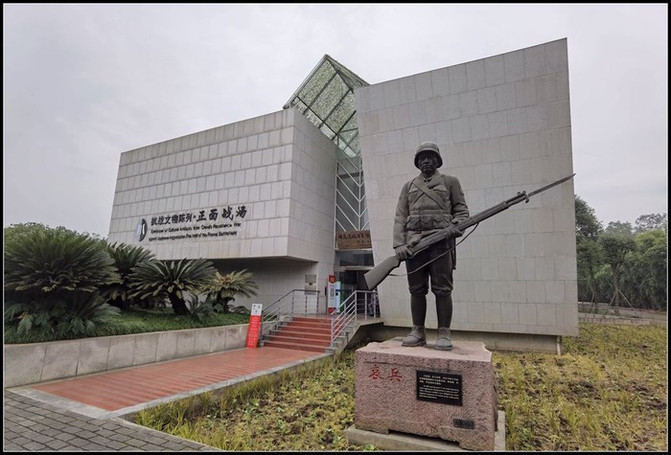 正面战场馆,这个展本馆通过文物、图片、历史资料再现当年国民政府和军队的抗战情况。该馆分三个单元:第一单元抗战缘起,简要介绍1931年至1937年国民党政府从避战到抗战这段历史,重点介绍国民党部分爱国将领的局部抗战。第二单元正面战场,主要以国民党军队在抗日战争中的二十二个重大战役为主要展示内容,真实地重现中日军队对决场景。第三单元空中御敌。