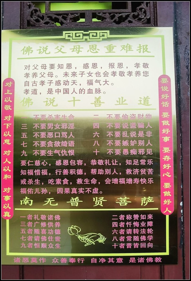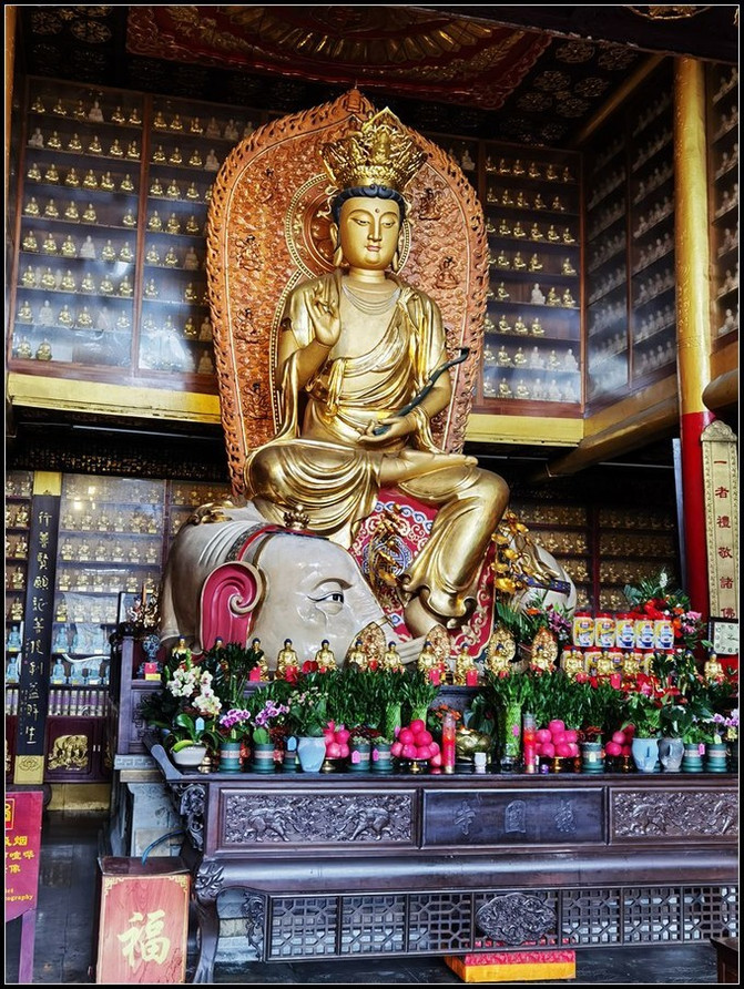 峨眉山-报国寺普贤殿里供奉普贤 菩萨 金像。普贤 菩萨 梵语为“三曼多跋陀罗”,即普遍贤善的意思。普贤因广修“十大行愿”,又称“大行愿王”。“愿”是理想,“行”是实践。峨眉山是普贤 菩萨 道场,所以将他供于最后一殿。殿门上写着“金粟庄严便是 菩萨 住处;昙花灿烂照彻纳子爱心。” 意思是用金黄色装饰的殿堂, 是普贤 菩萨 的住处;优昙花灿烂的光辉,照透了禅僧的爱佛之心。