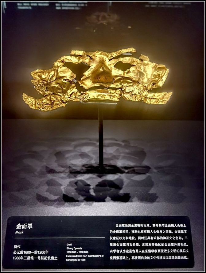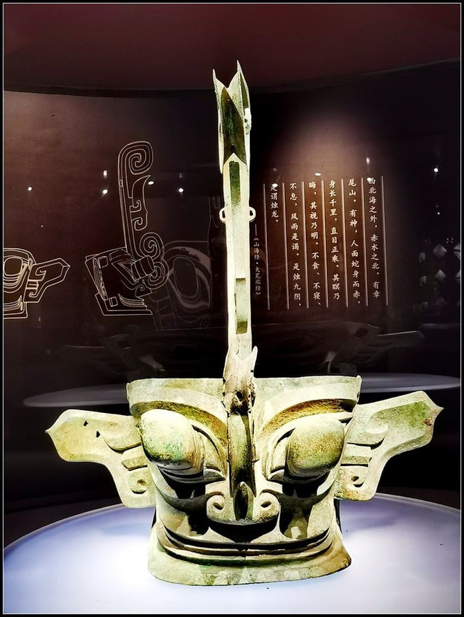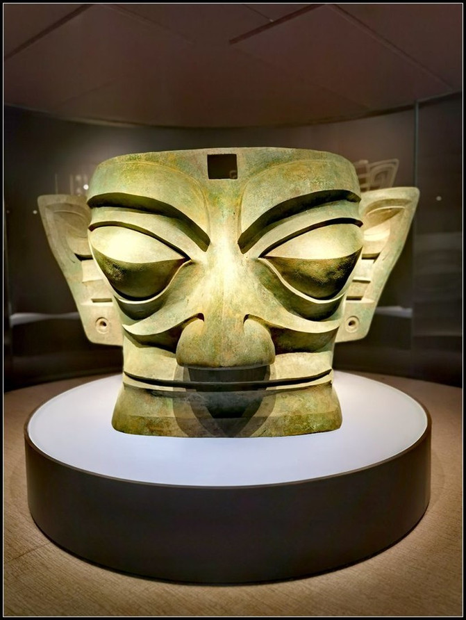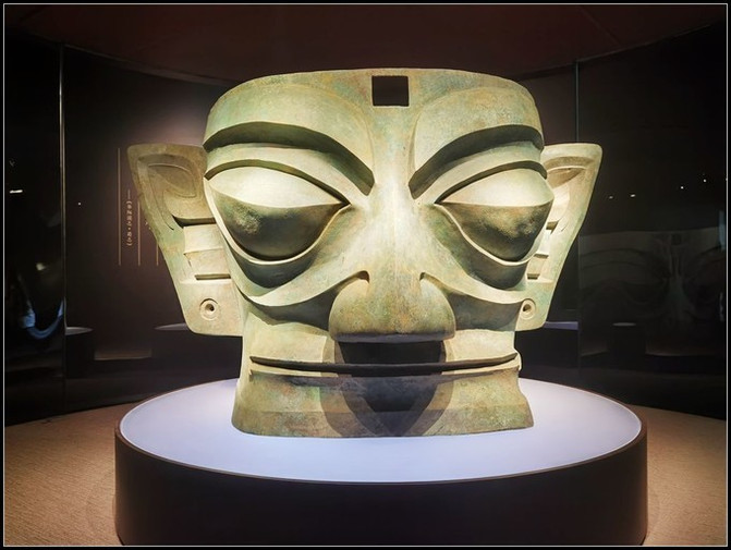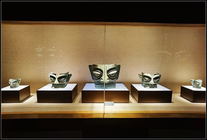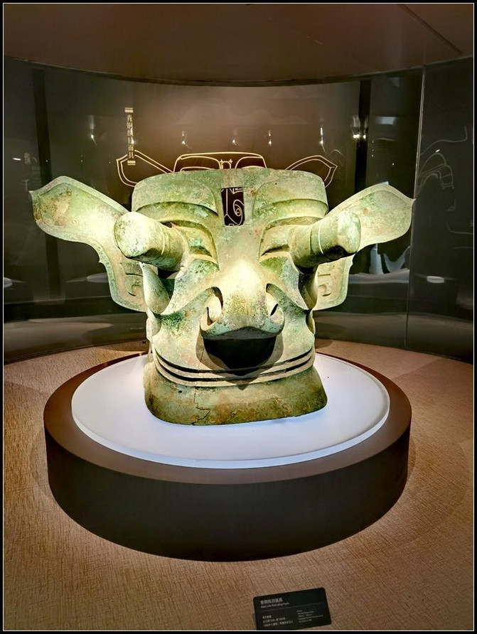三星堆博物馆三星堆博物馆三星堆博物馆三星堆博物馆大型青铜兽面具宽138厘米,重80多公斤,造型极度夸张,方形的脸看起来似人非人,似兽非兽,角尺形的大耳高耸,长长的眼球向外凸出,其面容十分狰狞、怪诞,可谓青铜艺术中的极品。