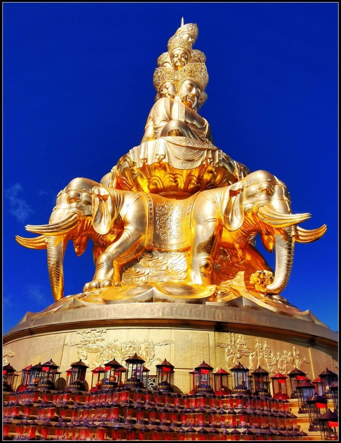 峨眉山金顶峨眉山金顶金顶普贤殿内供奉普贤 菩萨 骑象铜像,普贤 菩萨 端坐在莲花台上,手执如意,莲台置象背上,白象脚踏四朵莲花。整个造像通体铜铸,通高4.5米。