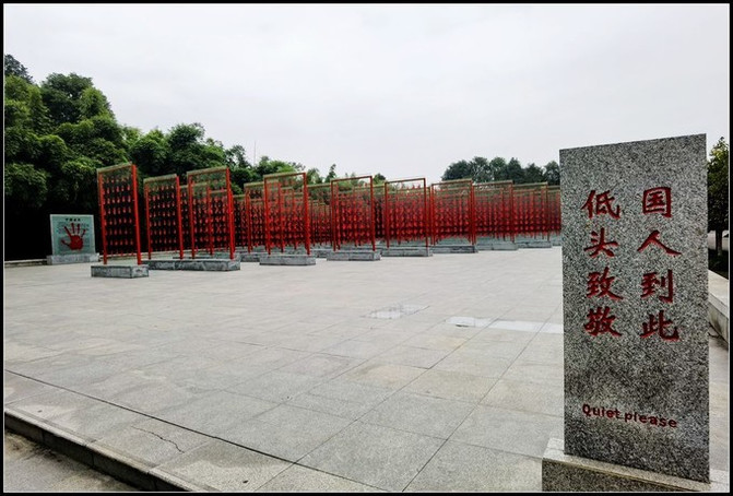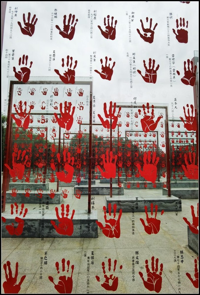 抗战老兵手印广场。这里的每个手印的主人都是当年参加过抗战的老兵。他们中,年龄最大的99岁,最小的也有79岁了;有的已经去世,有的至今还健在。碑林使用的材质是钢化玻璃,采用腐蚀的方法将手印印在钢化玻璃上。这种材质坚硬透明,喻意老兵的心同天地阳光一样明亮而充满生机。色彩鲜艳的手印,象征老兵爱国牺牲的精神。每个钢化玻璃碑宽2.4米,高3.7米,基座用花岗石。碑林是老兵的汇集,是英雄和力量的汇集,更是民族精神和气节的汇集!