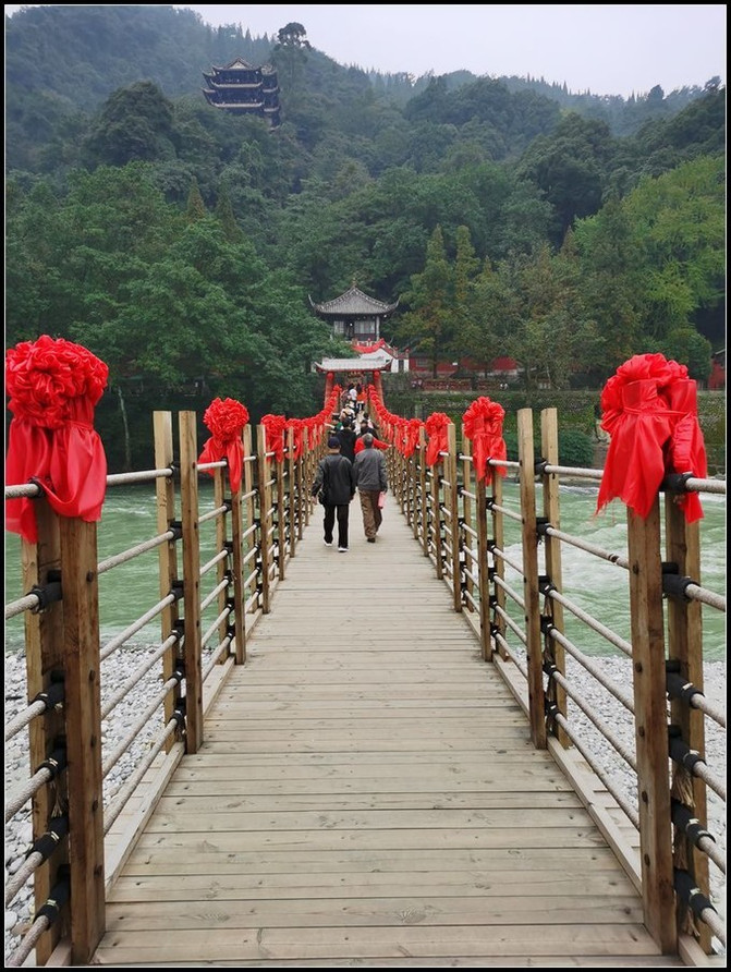 都江堰景区都江堰景区都江堰景区都江堰景区安澜索桥又名安澜桥、也被称为夫妻桥。位于 都江堰 鱼嘴之上,横跨内外两江,被誉为 中国 古代五大桥梁之一,是 都江堰 最具特征的景观。始建于宋代以前,明末(公元17世纪)毁于战火。古名珠浦桥,宋 淳化 元年改名评事桥,清嘉庆建新桥更名为安澜桥。原索桥以木排石墩承托,用粗竹缆横挂江面,上铺木板为桥面,两旁以竹索为栏,桥为钢索混凝土桩。