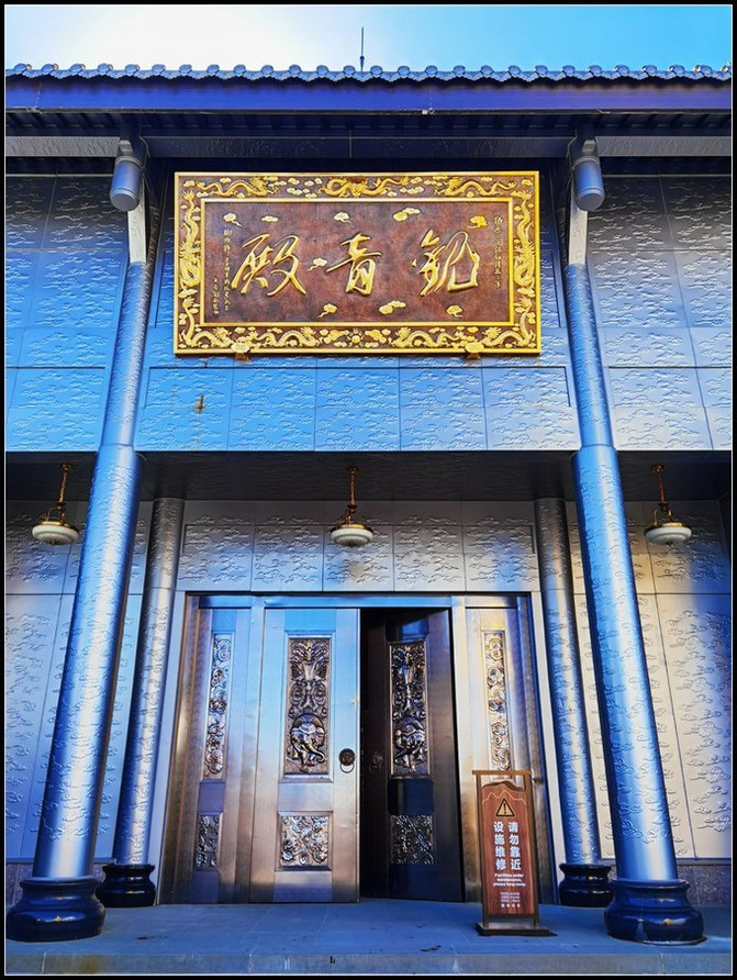 峨眉山金顶大雄宝殿殿门正中是黑底金字的大雄宝殿匾额,两侧有愿王圣地;、灵山一会、银色世界、梵宇重光等匾。殿中供奉着铜质金身的三身佛,坐高3米。殿内还有铜磐、铜钟等法器以及铜铸像、铜普贤像等佛教文物。