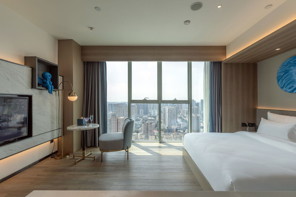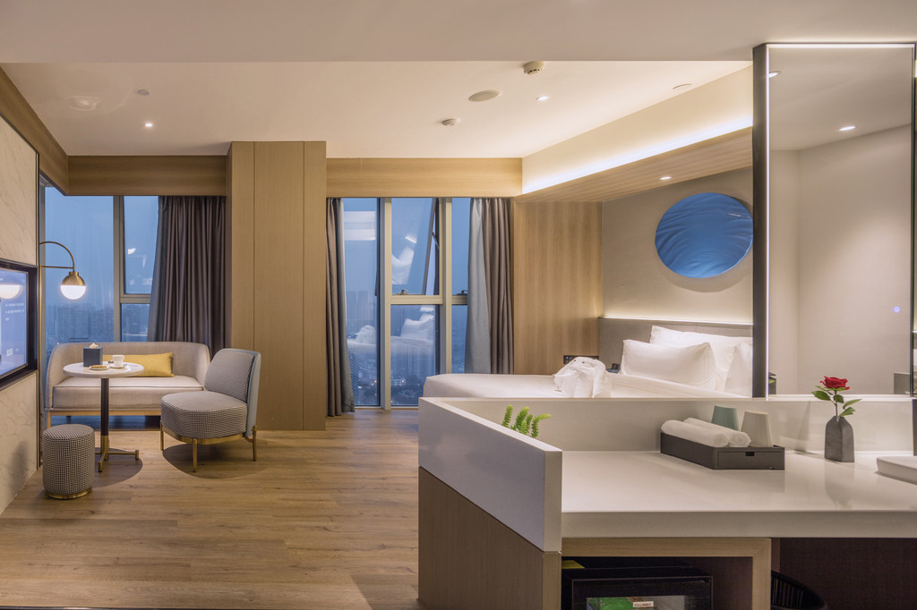 酒店有86间风格各异的客房,有32楼的转角浴缸?房,有35楼的loft复式客房,也有34楼270度的观景房,33楼最舒适的榻榻米客房。