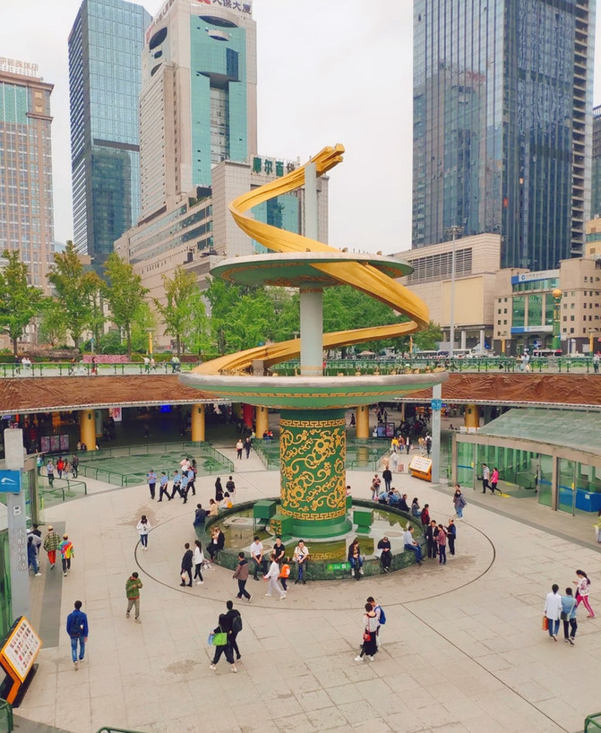 天府广场太阳神鸟矗立在天府广场的中心,这里是地铁1号线和2号线以及即将通车的地铁18号线的交界口, 成都 东南西门交通大动脉的最中间节点。