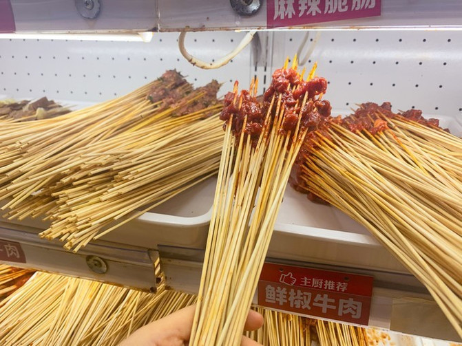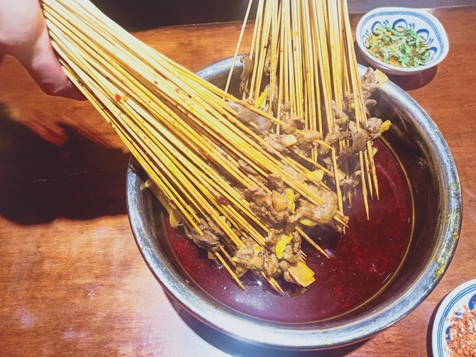 成都瓜串串牛肉串串是百搭:给我一片牛肉,就能卷出一个世界,五香、麻辣、香菜、泡椒、大葱,牛肉要通过秘制酱料腌制两三个小时,一颗颗饱满的泡椒加上软嫩的牛肉,一丝丝绿色加在红色的牛肉中间格外显眼,吃进嘴里在舌尖爆发出的重口味,在厚实的牛肉粒中,裹着随时准备爆汁儿的泡椒,嘴上说着不要身体十分诚实,一串串地往嘴边送。