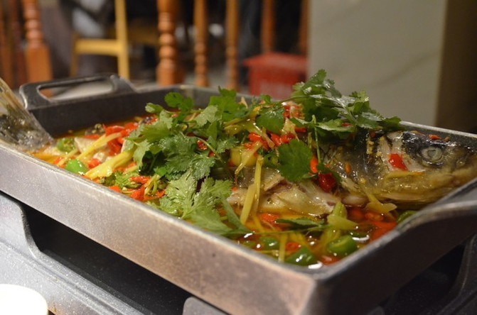缘贡活水花鲢:花鲢个头挺大的,鱼背用刀切翻了几片,这样更容易入味的,鱼肉雪白细腻,芹菜和青椒段特别好吃,简直是我的最爱啊。