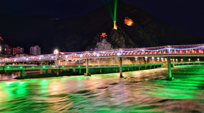 太子岭滑雪场回来的时间正好是晚上,顺便观赏了汶川的夜景,车上放着温柔感人的歌曲,望着车窗外,水流湍急冲撞着新桥,