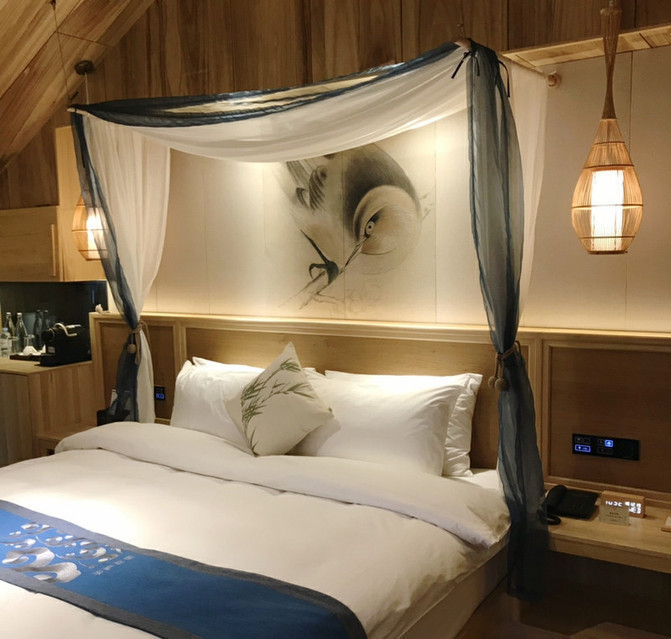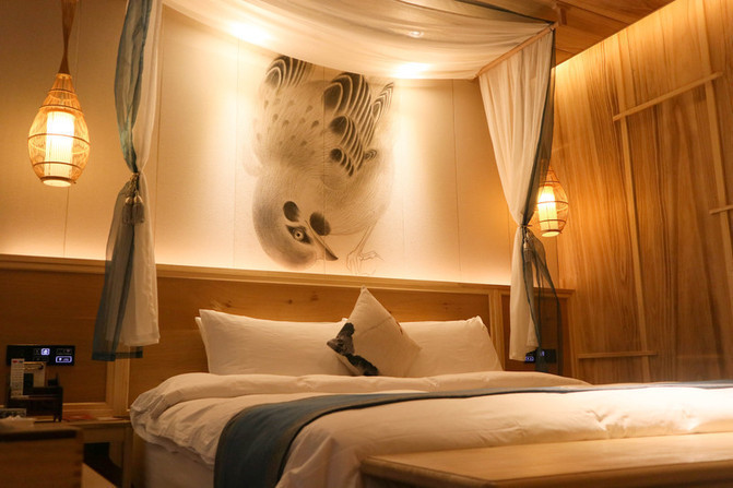 酒店风格:这间民宿的整体风格是我非常喜欢的,客房设计偏日式,是纯木质结构打造的,房间味道闻起来有一股独特的香味,很舒心。房间里还有手工蜀绣,还有绘画大家特意画上去的鹪鹩鸟。