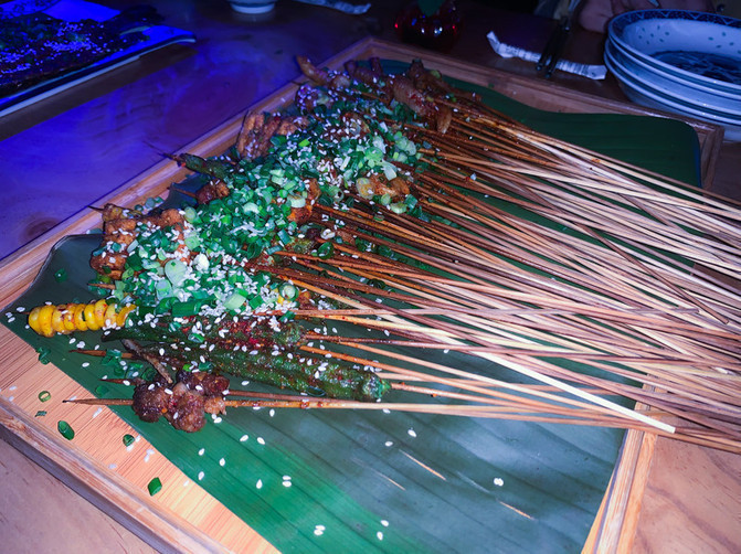 烧烤大拼盘,傣式风味把把烧,份量很足,荤素都有,味道不错,肉类、内脏烤得很嫩,轻轻一咬就脱签。