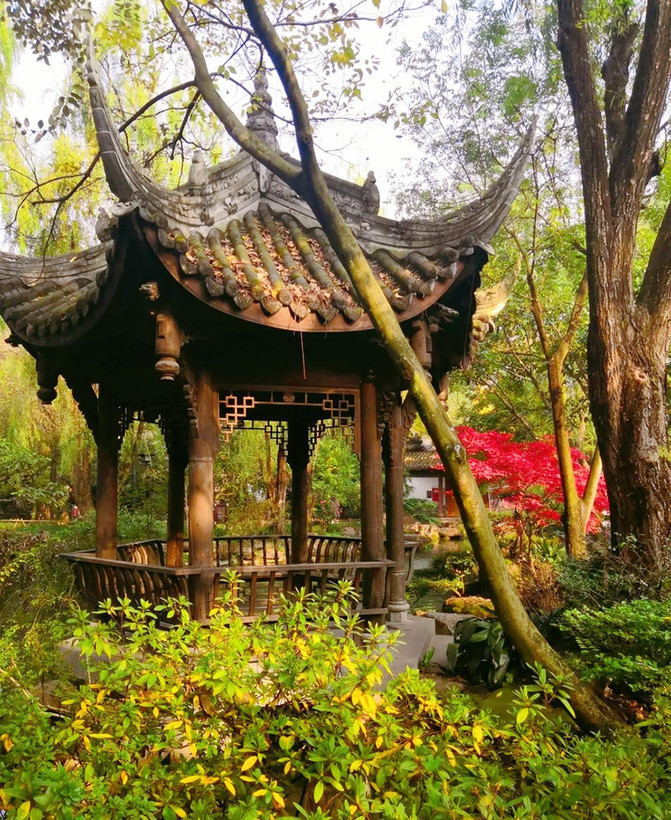 武侯祠一路走走停停,转幽静,赏盆景,观花草,闻暗香。看盘根错节的古树,观玲珑壁巧的拱桥水影,叹满目疮痍的汉宫残柱。怀着对于蜀国凭吊的敬意,缓缓地走了出去。