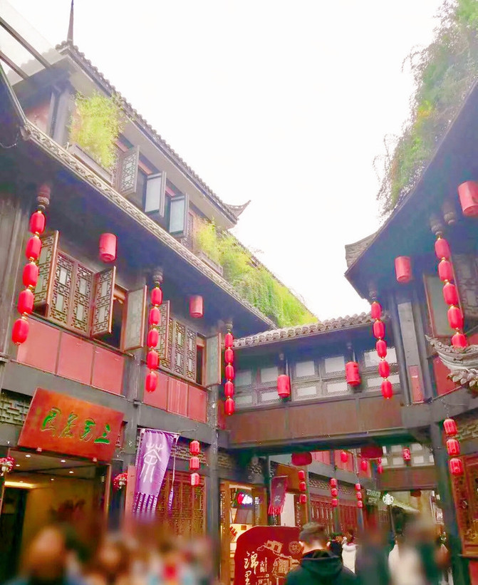 锦里古街我们初去时,天空一片晴朗,漫步锦里,游人较少,倒别有一番朦胧古典的意蕴。锦里街巷并不是宽,但两旁古楼相向而望,串串红灯笼高高低低地,或挂在飞檐翘角下,或挂在树枝上,在朦胧的雨中,闪闪烁烁,独具风韵。