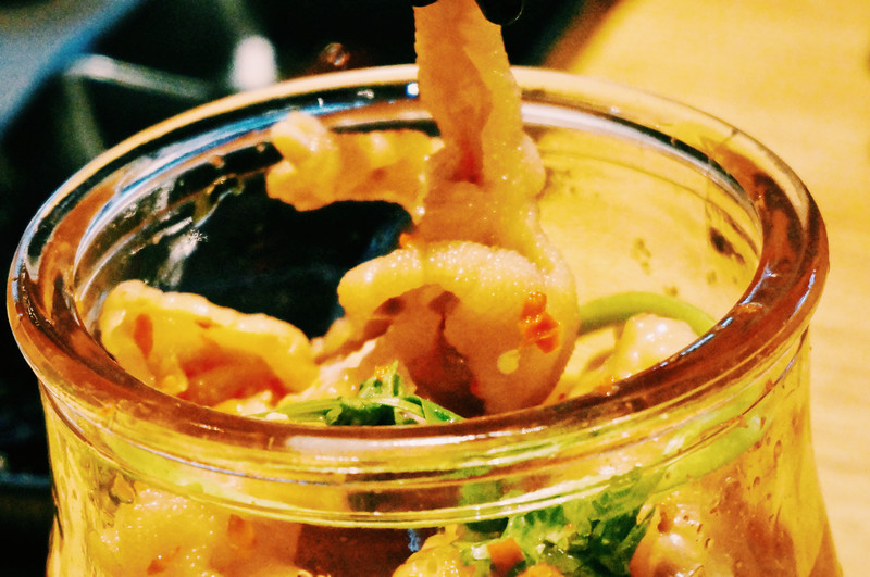 韭菜蘸水鸭肠:鸭肠处理的很干净,蘸秘制韭菜小料,吃起来完全没有腥味。刚上桌的时候,还差点当成了凉皮。