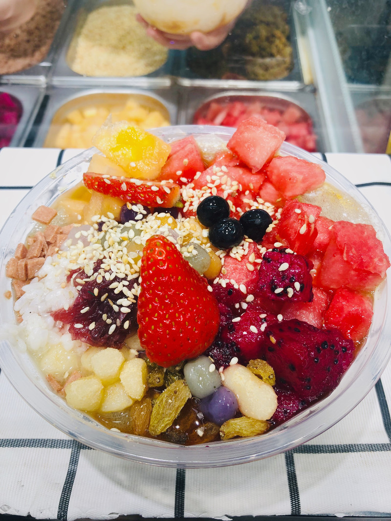 店里设有无限量赠送区,如按用餐人数点套餐,甜点、小吃、主食等可无限量免费提供。推荐几款本人很喜欢的高颜值美味甜品和主食:爆浆蛋糕、网红椰子碗、芒果糯米饭、兔子布丁。