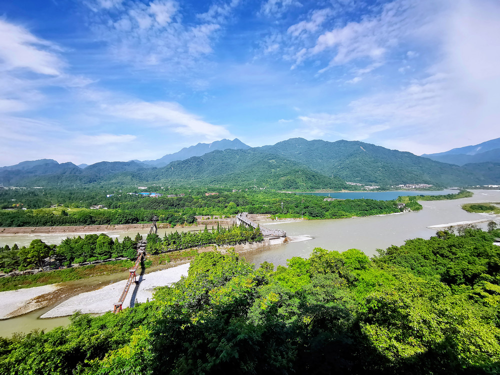 秦堰楼,因都江堰建于秦国而得名,依山而立,雄峙江岸,峻拨壮观,是眺望都江堰全景的最佳位置,毛主席1958年就曾站在这里,登上秦堰楼极目眺望,都江堰三大水利工程、安澜桥、二王庙、古驿道、玉垒雄关尽收眼底,甚为壮观,沐浴在柔和的山风中,放眼望去,峰峦叠嶂,滔滔江流,翠绿之色渐浓。