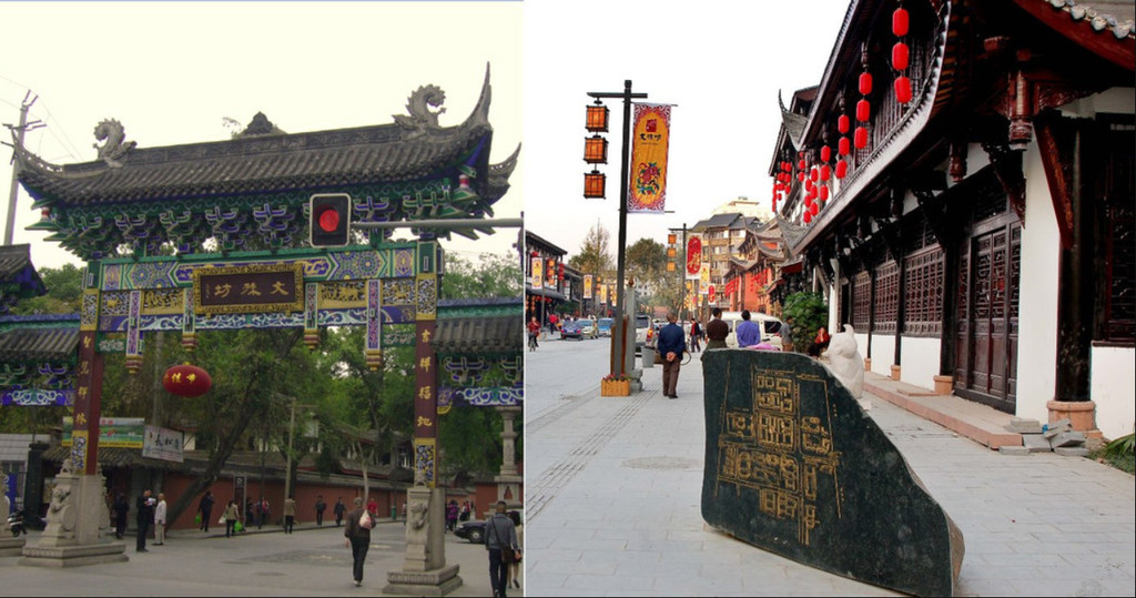 从文殊院出来,旁边的一大片古建筑群就是文殊坊。这是一片依托文殊院形成的民俗老街,汇聚了许多成都特色小吃和餐饮、民俗购物店、古玩字画、茶楼和文化会所。比如大家耳熟能详的龙抄手、钟水饺、赖汤圆、陈麻婆豆腐等都在此开有分店。