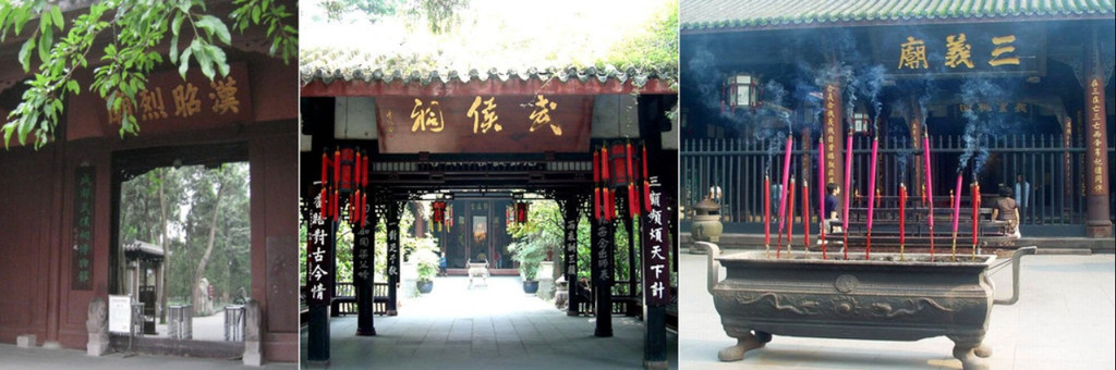 通常说的武侯祠分为文物区、园林区和民俗区三部分。游客买票入内参观的是文物区,由汉昭烈庙、武侯祠和惠陵三部分组成。汉昭烈庙祭祀的是蜀汉开国皇帝刘备,葬于惠陵。武侯祠祭祀的是中国人无人不知、无人不晓的诸葛亮,因其生前被封为“武乡侯”而得名。武侯祠是中国唯一的一座君臣合祀祠庙,也是最负盛名的三国文化遗迹博物馆。现存建筑均是公元1672年清康熙年间重建的。