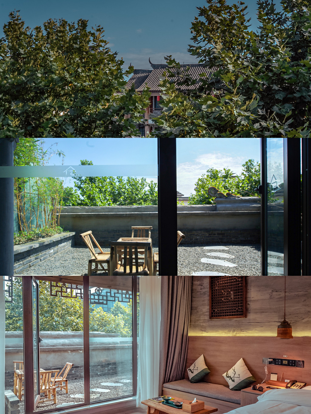 藏在古镇上的宝藏私汤民宿。窗外的梧桐树一年四季景致都美,楼顶露台能看到远处的山,傍晚尤其美。