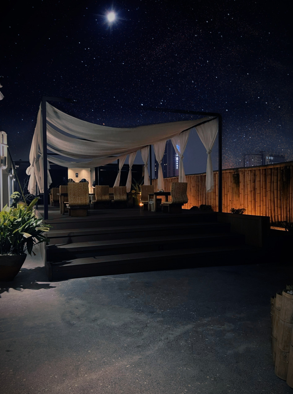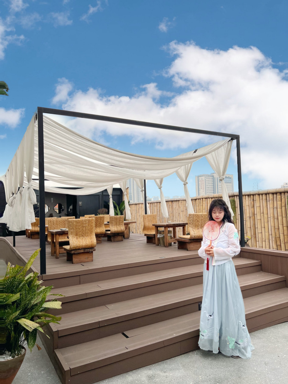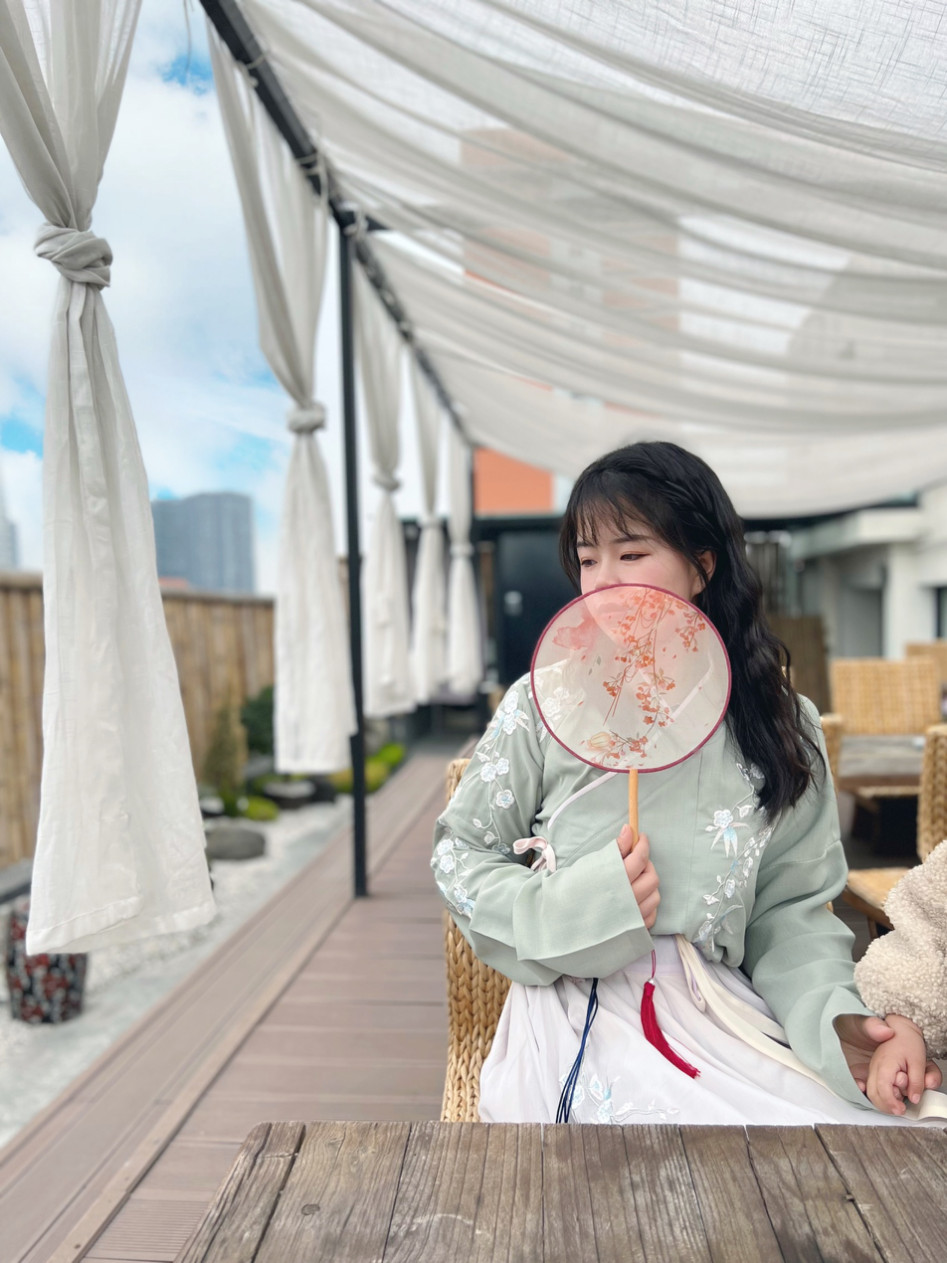 🔻国风汉服体验绝绝子团扇、香囊、发带都准备齐了,很贴心。建议大家换好衣服去天台露天茶室拍照,蓝天白云搭配茶室的帷幔绝美。