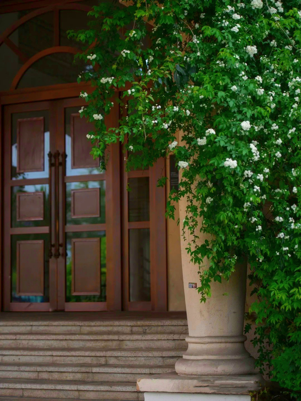 满墙的枝条垂顺而下,绿色的瀑布上点缀着密密麻麻的白色小花,背后就是极具欧式风格的建筑,拍出来的照片太好看了!
