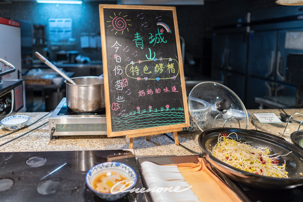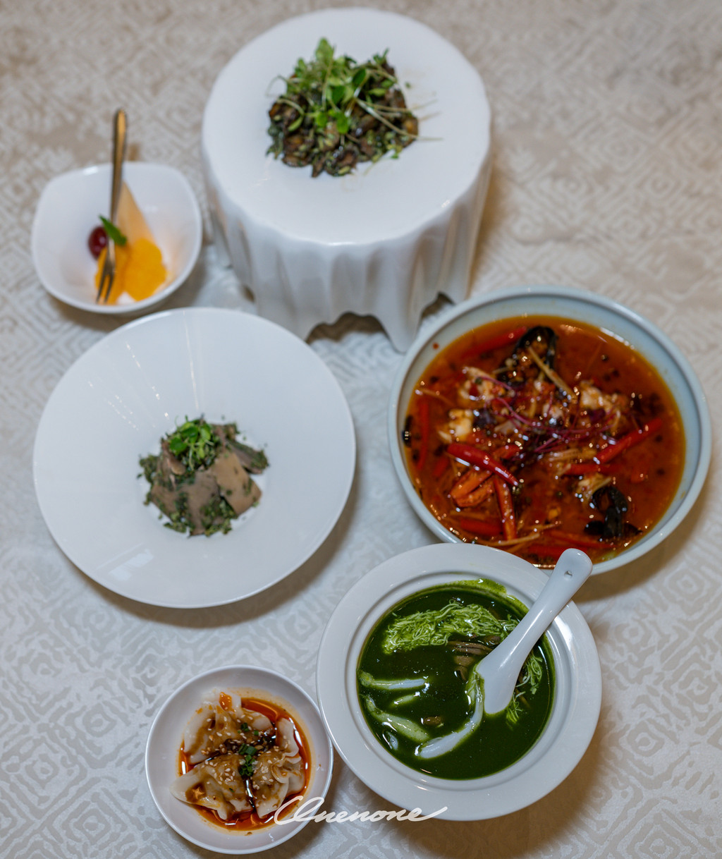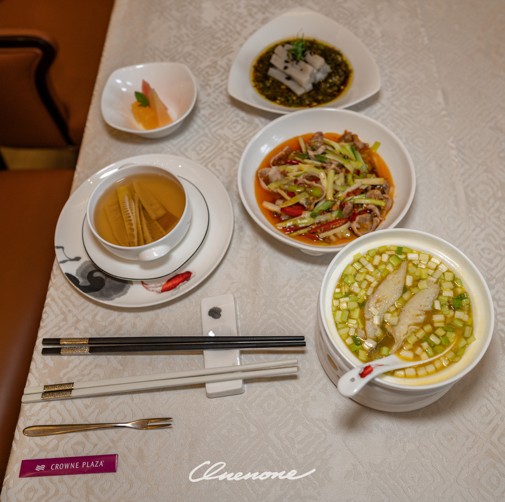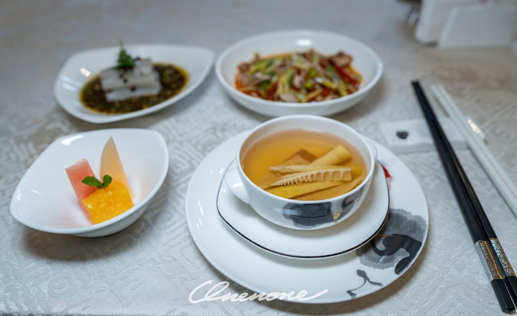 餐前水果、凉菜拼盘:冲菜北极贝、脆皮吊烧猪腩、鱼籽青豆糕、椒麻脆笋、黑蒜炖乳鸽汤、石梯粉蒸鱼、香椿芽炒玉带、青椒毛血旺、绵阳米粉配麻薯包。