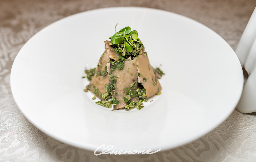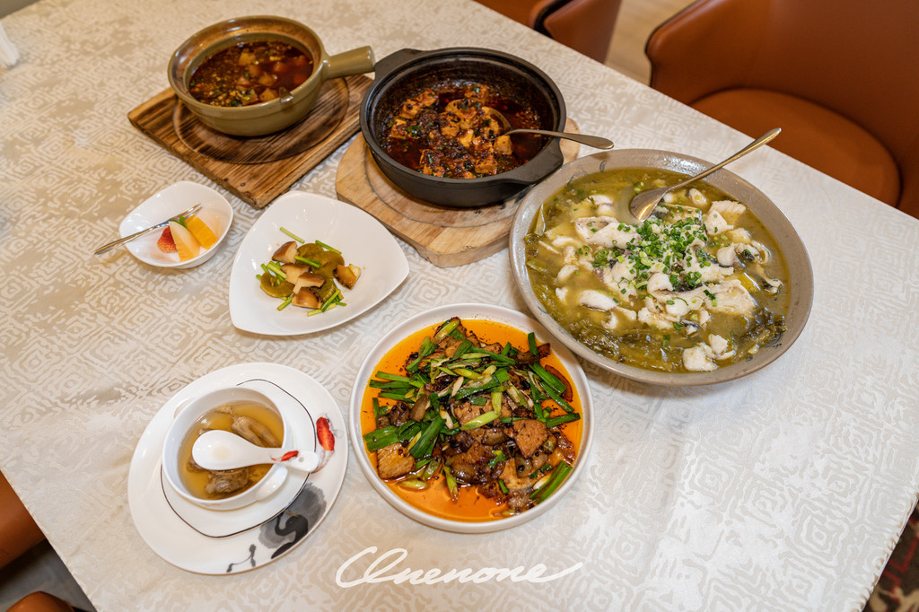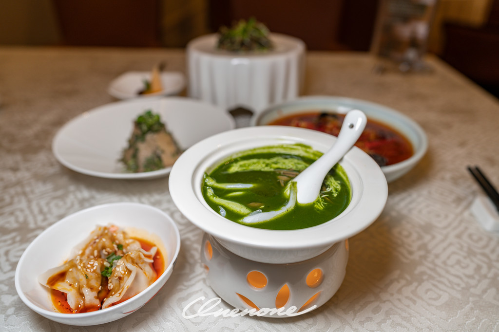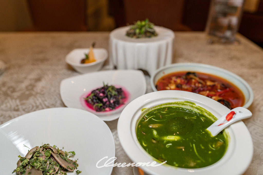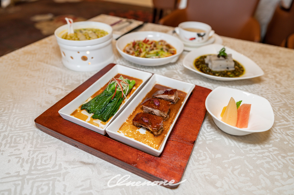 餐前水果、凉菜拼盘:冲菜北极贝、脆皮吊烧猪腩、鱼籽青豆糕、椒麻脆笋、黑蒜炖乳鸽汤、石梯粉蒸鱼、香椿芽炒玉带、青椒毛血旺、绵阳米粉配麻薯包。