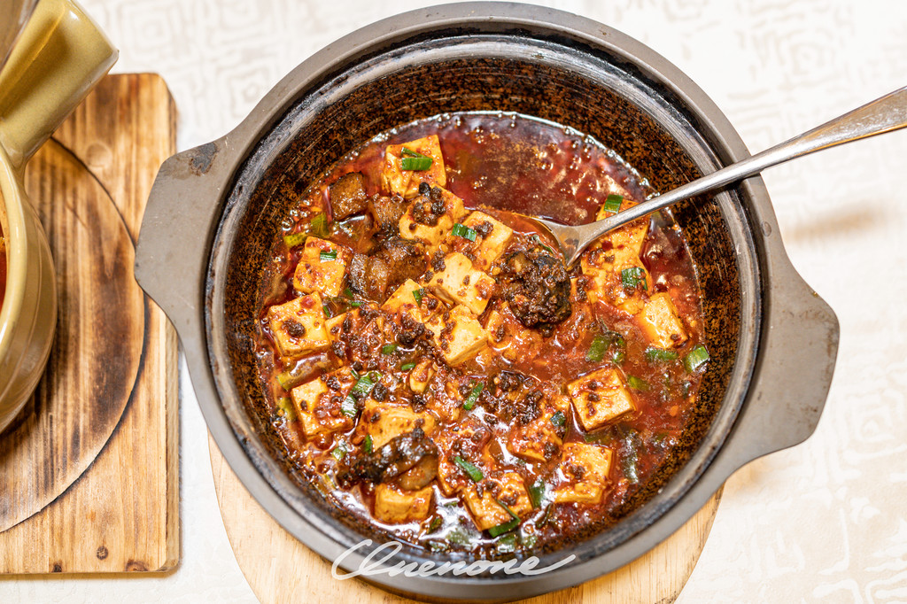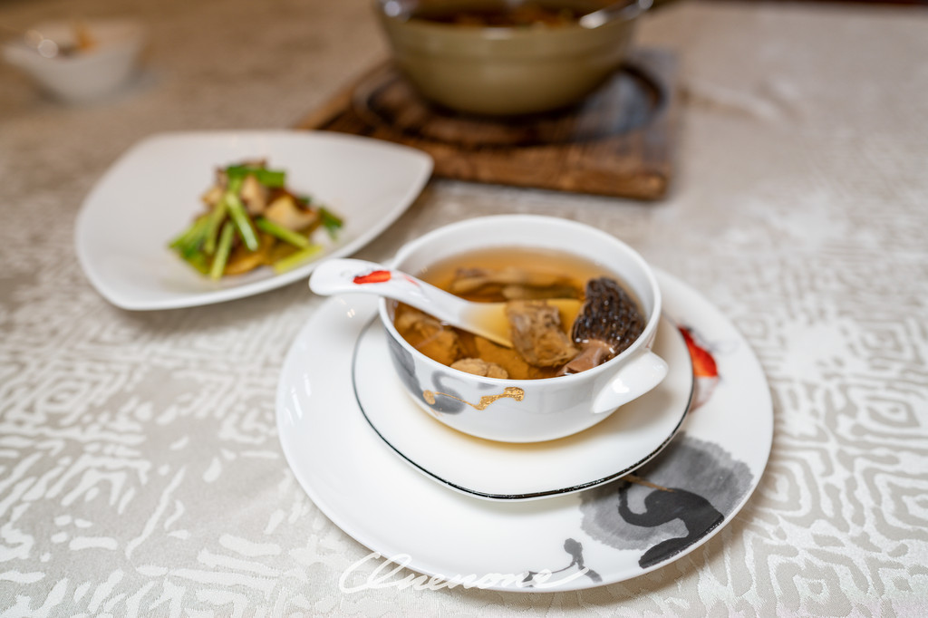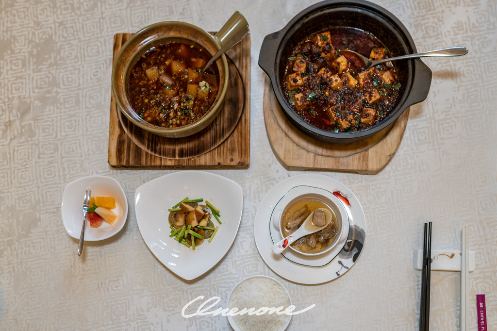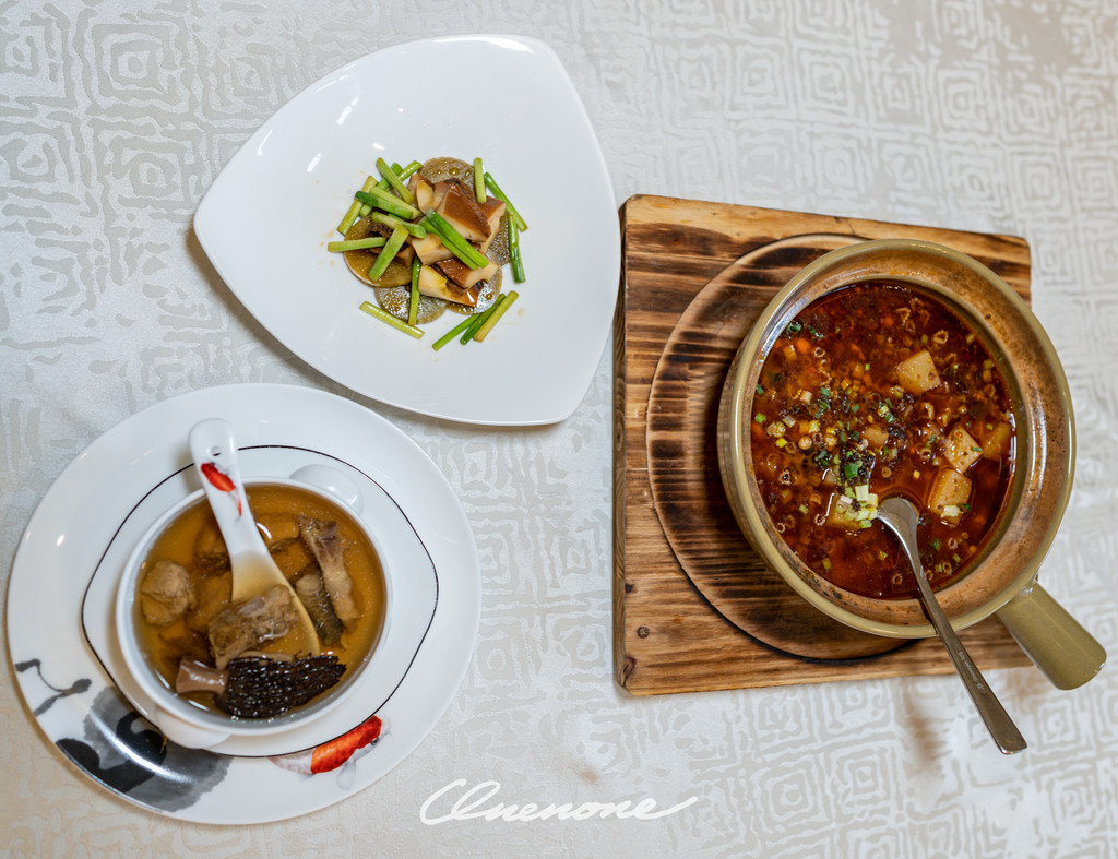 餐前水果、羊肚菌炖老鸡汤、独蒜拌鲜鲍鱼、石锅麻婆豆腐炖海参配米饭、砂锅米凉粉、酸菜鱼(草鱼)、回锅肉。