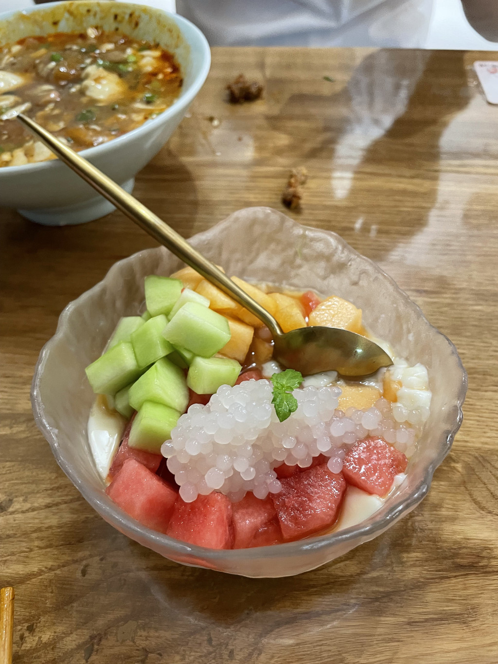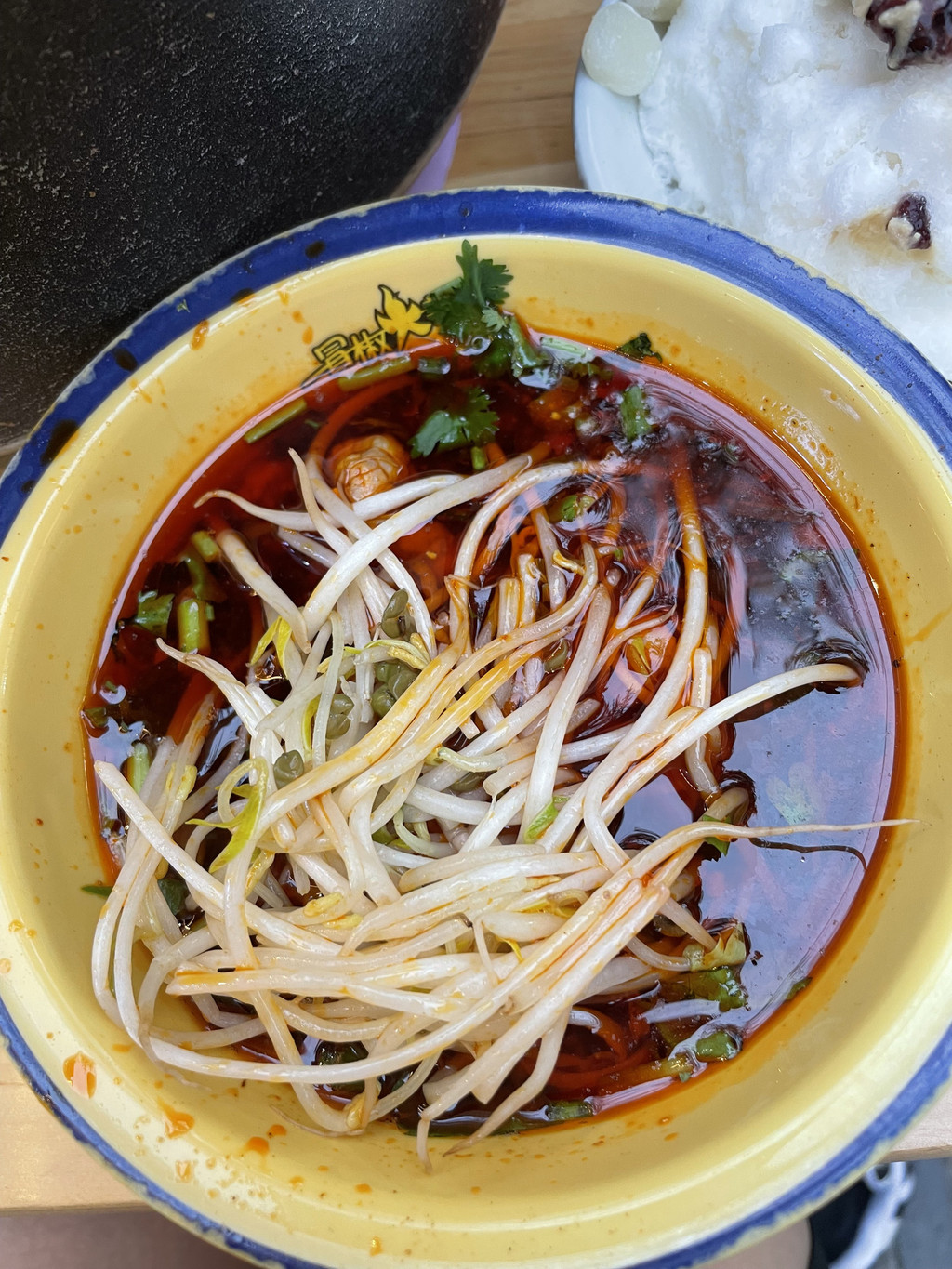 队友点了两杯看似饮品的菜,没想到上来是两碗冰沙,就这两晚冰沙,让队友淡定的,一口冰沙一口辣,享受着冰火两重天