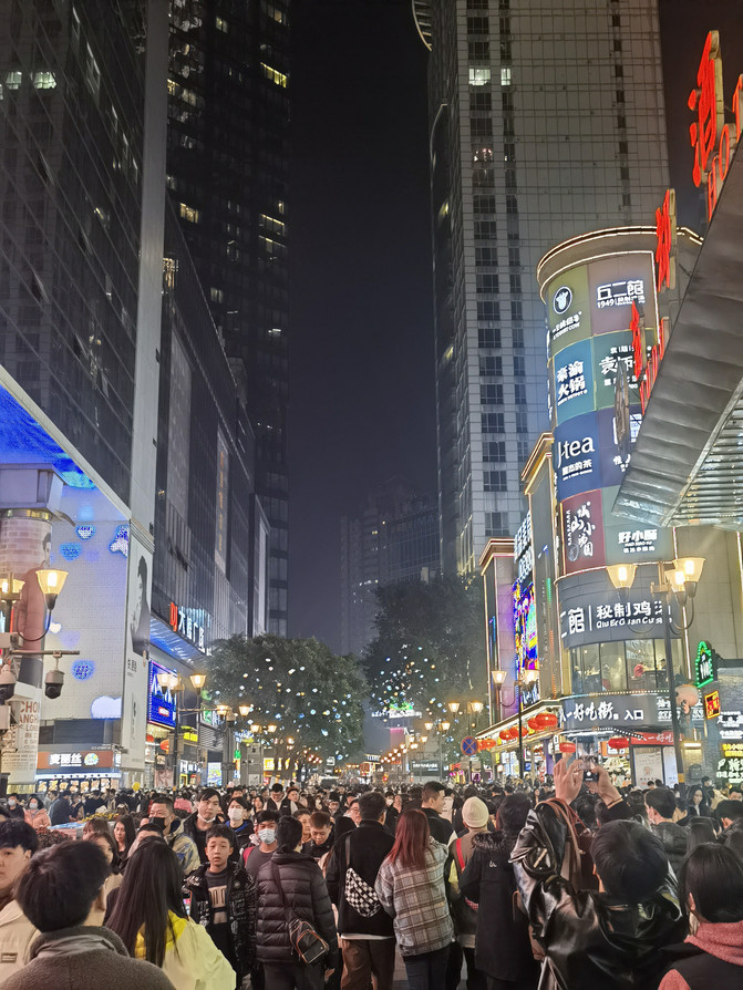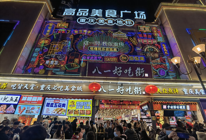 八一路好吃街,真的是人山人海啊,烤苕皮什么的当地特色都可以尝尝看,正好一路解放碑步行街逛逛,走到洪崖洞拍拍照。
