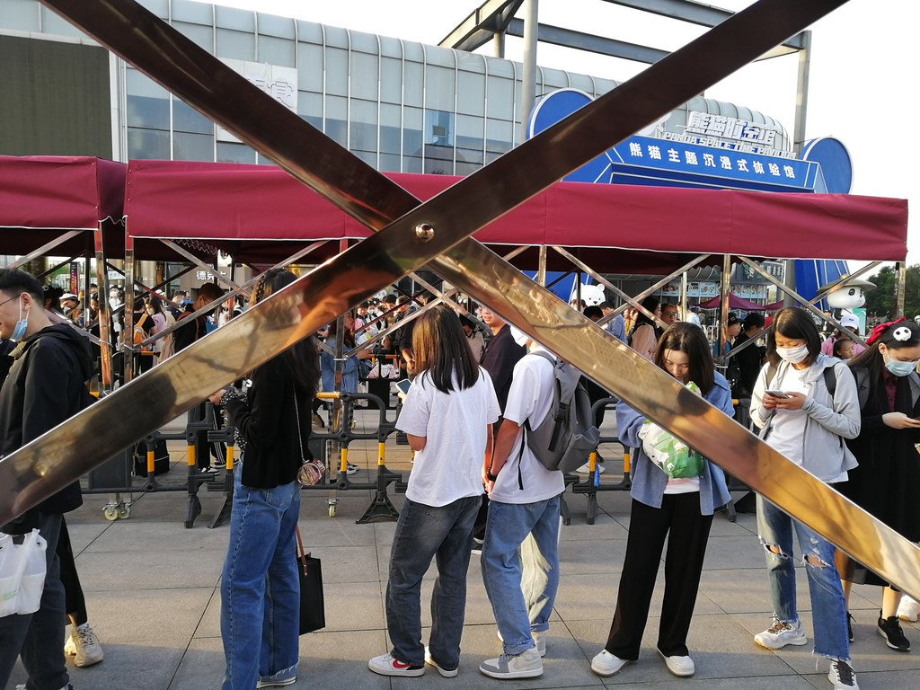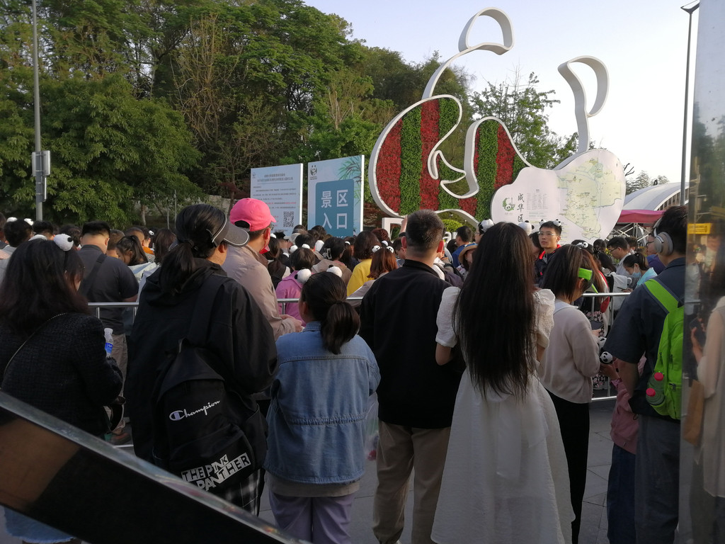 凌晨五点多起了床,洗漱并吃了点昨晚买的面包后不到六点就到了地铁站,向第一个景点熊猫基地进军。在我所计划要去的景点中,熊猫基地无疑是人气最高的一个,开门营业时间又最早,景点面积也很大,因此理应放在第一站。从地铁3号线熊猫基地站出来后看到不少拉客的黑车,而官方的景区直通车这么早是没有的,于是我和几个同路人每人5元拼了辆三轮摩托车。到达熊猫基地后果然发现已经有不少游客在此排队了。