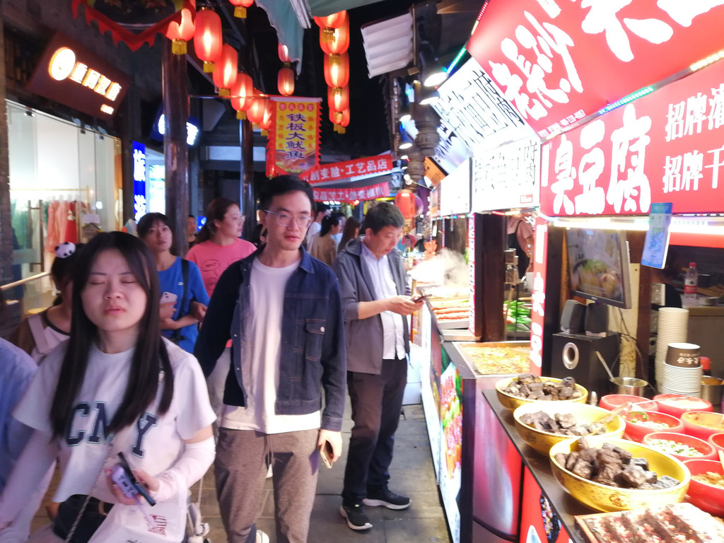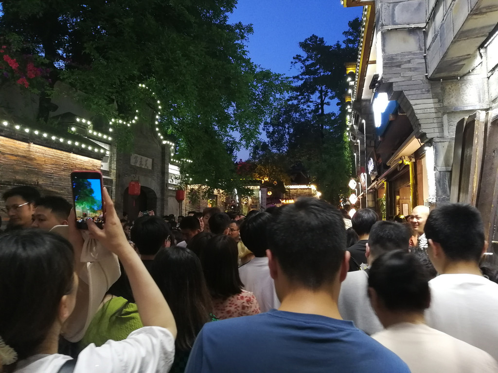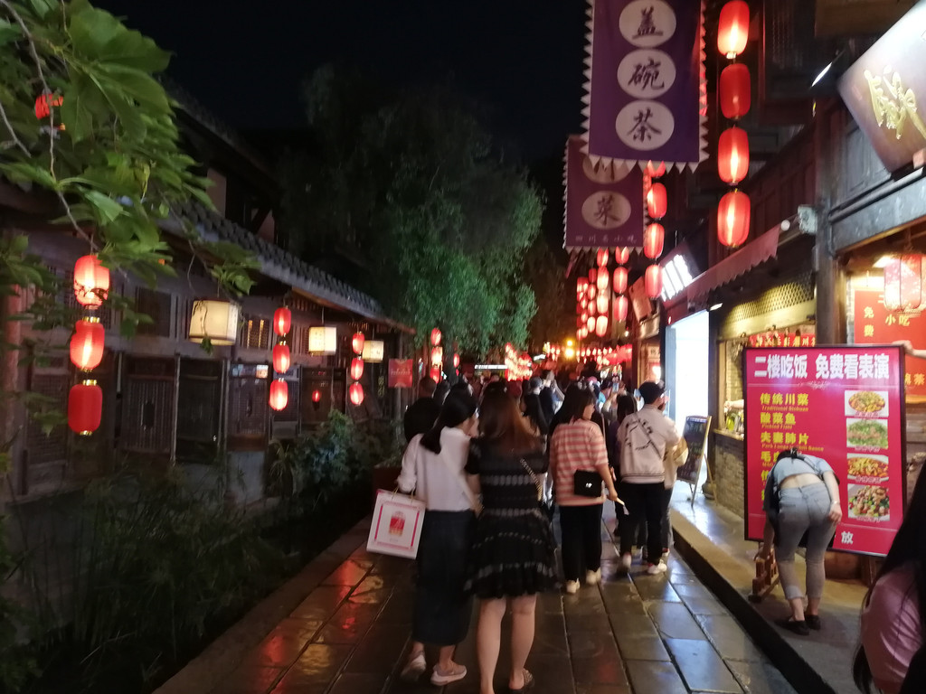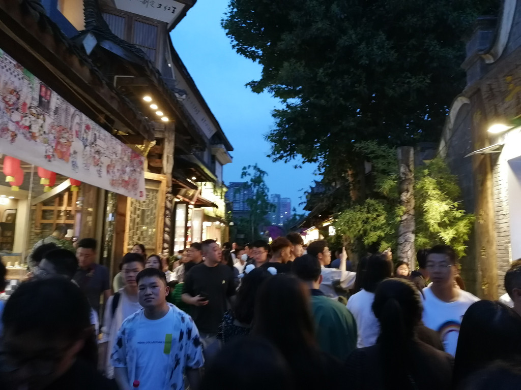 出发前看成都旅游的攻略书时就想尝尝特色小吃担担面,于是在武侯祠对面的一家小餐馆买了一份。虽然辣得我满头冒汗,但着实很好吃,而后步行了两个路口来到一家网吧泡了一个多小时,顺便订好了第五晚住的地方。终于耗到了夜幕降临可以逛锦里了。每个城市都有那么一个地方,本地人极少去而外地人一定要来打卡,就像我们天津的古文化街一样。我出门在外旅游通常没有早中晚饭的概念,基本是饿了就吃,逛这种小吃街的时候看到什么想吃的就尝尝,真的是太久没有感受过这种热闹的气氛了!