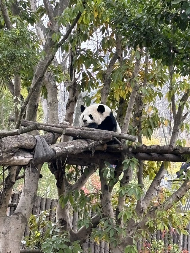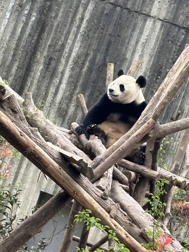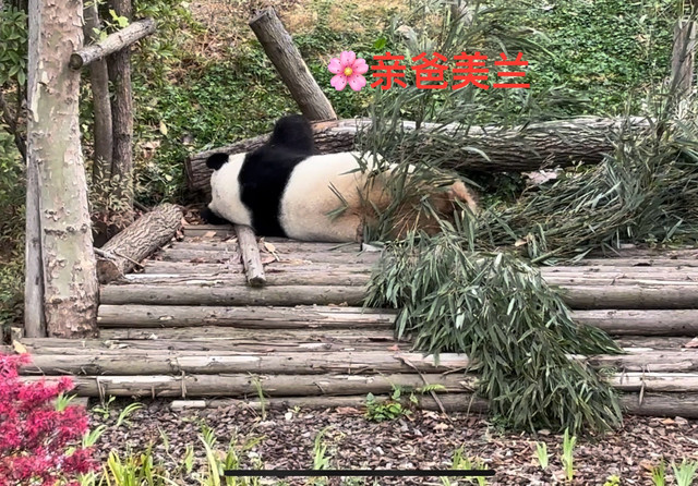 然后我们坐游览车(30/人)去了熊猫基地的很多站点,还看到了花花的干妈成园润(吃竹子)、花花的亲爹美兰(躺着睡觉)。还有幼年熊猫打架,滚在一起憨态可掬;也看见了很多国际友人慕名而来看熊猫。我们快离开的时候到中午了,熊猫们都进入了午睡时间,有的趴在树上,有的肚皮朝上,有的把下巴放在树杈上,姿势各异,实在很可爱。