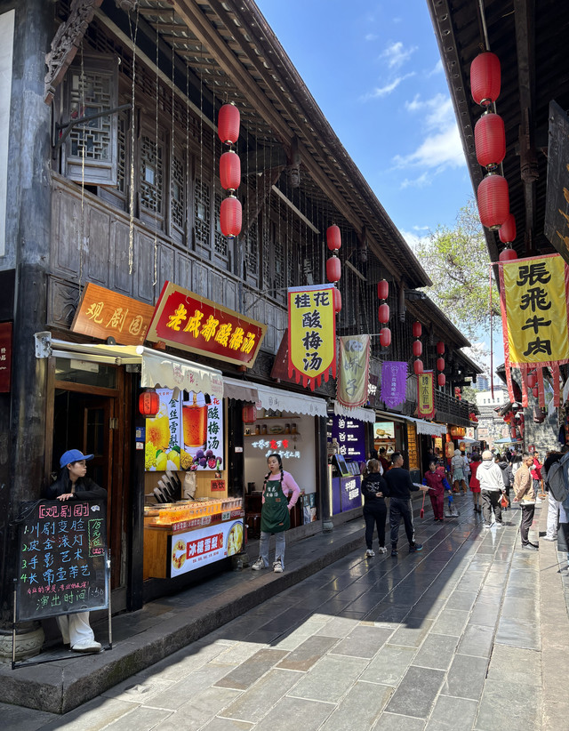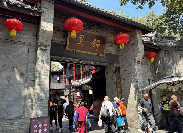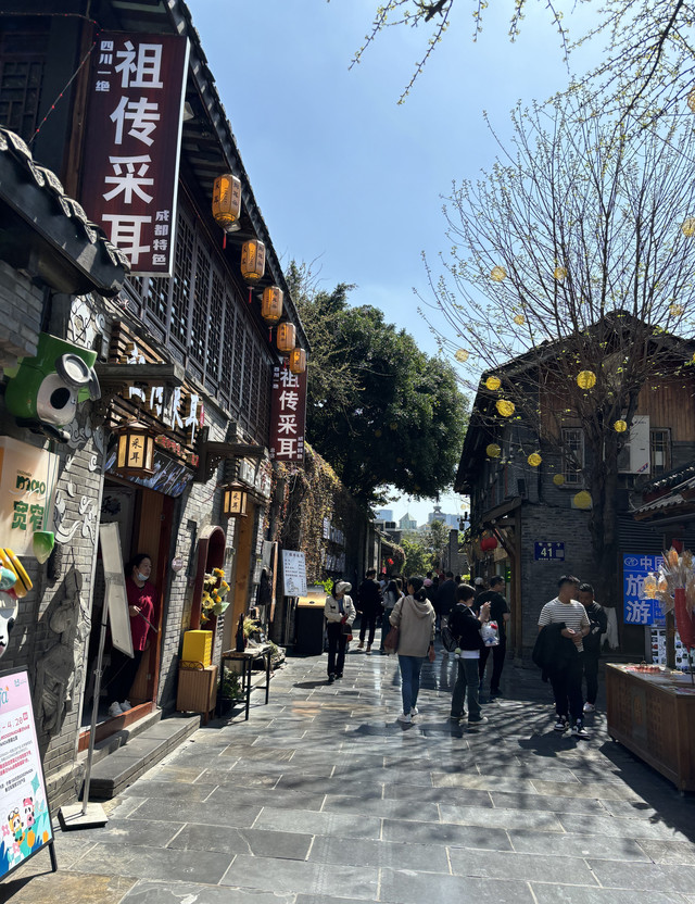 文殊院出来,我们就打车去了宽窄巷子。宽巷子和窄巷子都人多、很热闹。除了买特色糕点、手工特产,还有看川剧变脸、喝盖碗茶的民俗体验,叫卖声此起彼伏(感觉民风比浙江更加开朗热情,店员给试吃的点心都要戳到我们脸上了)本浙江i人都恨不得披个隐形衣哈哈哈。宽窄巷子附近我们找到了网红熊猫爷爷的店,在他家买了实惠的熊猫包包(6元一个)和熊猫挂件。人非常多,感觉也有代购的,大家都在翻找翻找。我匆匆选完赶紧买单,我们就往锦里赶了。