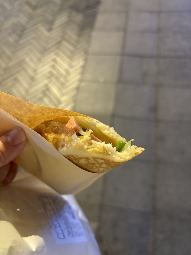 之后我们逛了逛商业街,买了冰粉,去了超哥的寝室楼就回酒店了~酒店下面买了蛋烘糕,还点了老妈兔头总店的兔腿,蛋烘糕皮糯糯有弹性/馅料选的土豆丝香肠味道很香;兔腿卤得很入味,肉质紧致鲜美,我吃了两只!(zp这天的行程就这样结束啦!