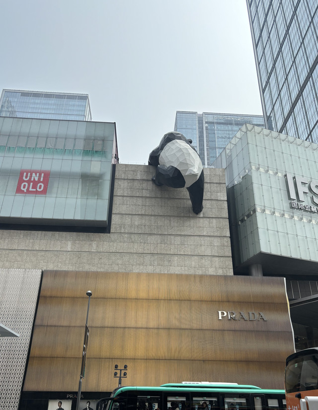 大巴快要到终点的时候,就看到了太古里裸眼3D大屏,还有爬在Prada上的熊猫成都,哈哈!