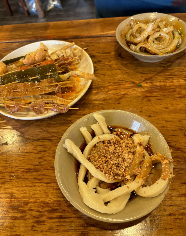 下午的行程是成都博物馆,我们就在那附近找了一家小名堂担担甜水面。点了网上推荐的钵钵鸡、甜水面和旋子凉粉。钵钵鸡一元一串,红油的很鲜美(蔬菜和肉类都是~);甜水面我很喜欢,酱料甜甜的,有花生粒很香,粗面条又弹牙;超哥吃了旋子凉粉,酸酸辣辣甜甜的也赞不绝口。