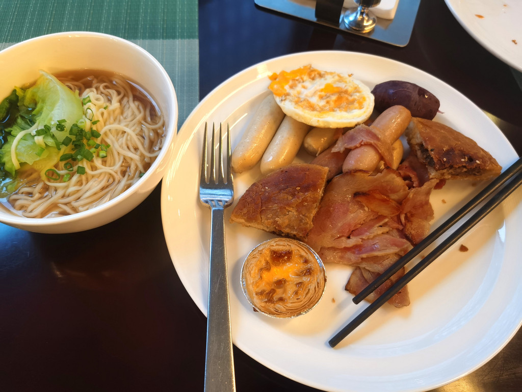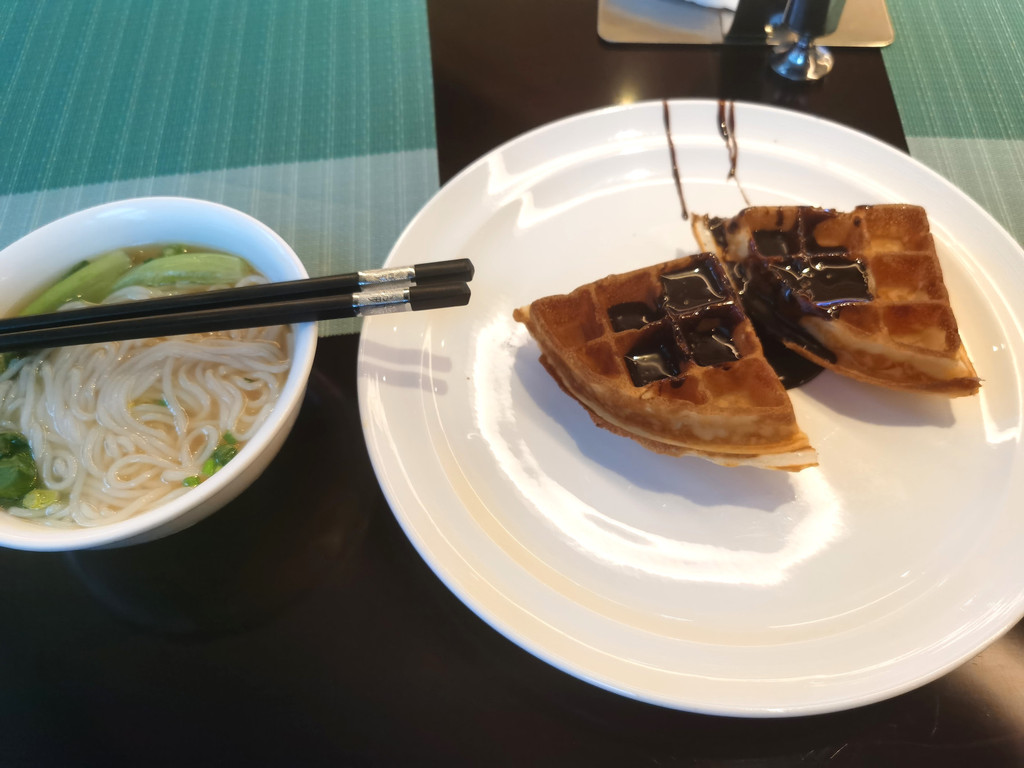 图3.1:中西合璧的早餐——青菜汤面、巧克力酱华夫饼