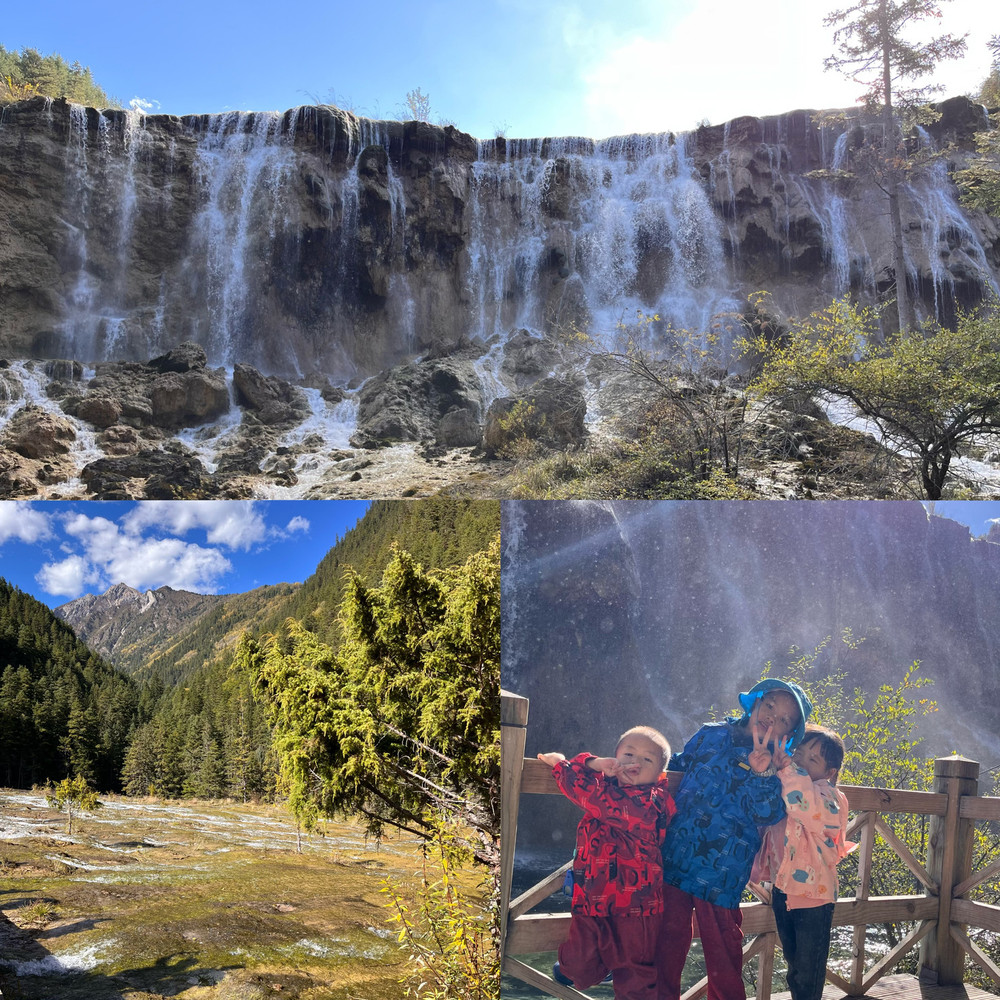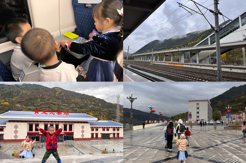 成都的高铁站设计很不合理,只有一个入口,一条电梯和一条楼梯,开车前10分钟还很多人在排队进站。到黄龙九寨站一路都在穿山洞,窗外一片漆黑,只有到了中途几个站才看到光明。小孩子们一路吃呀玩呀,还算很欢乐,完全不在意窗外风景。到站啦,降了10度+,大家都换上厚衣服。