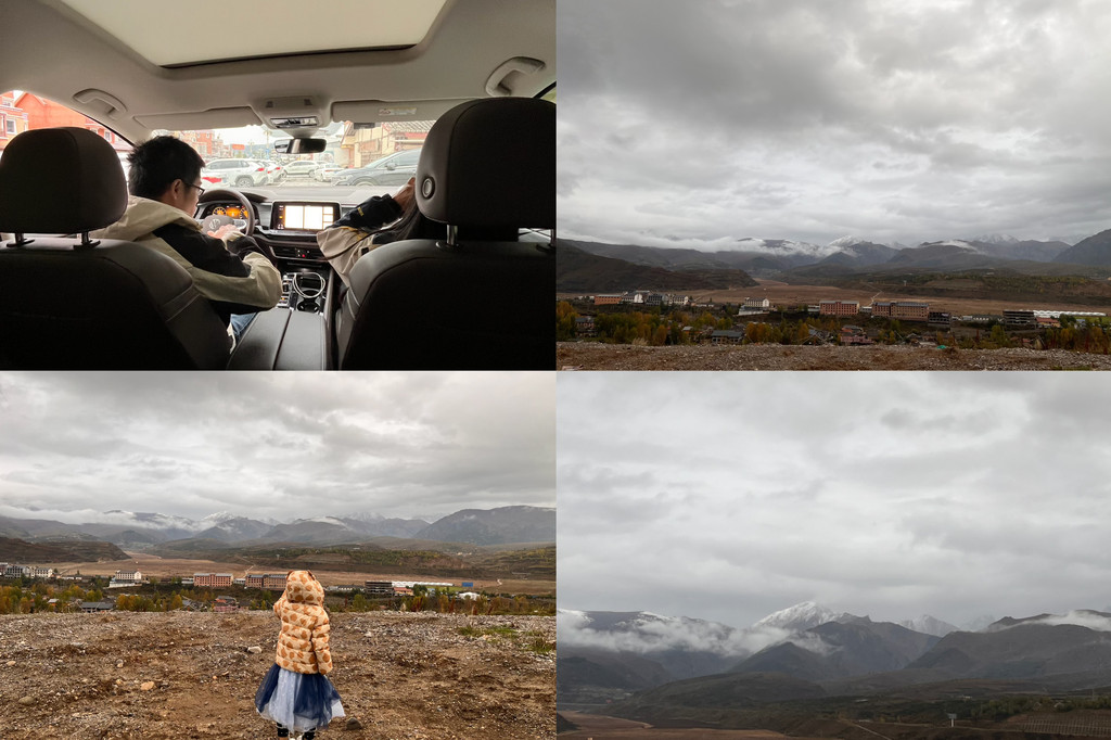 就近租了个七座车,但是不送过来高铁站,只能自己打车过去取车。第一次遇到打不到滴滴的地方——黄龙九寨站,加了价也没车过来,只能打路边的的士,十分钟左右的路程到川主寺镇要40块。取了车后,一路奔九寨沟镇,下起了小雨,海拔越来越高,气温越来越低。远处的是雪山吗?中途停了下看雪山呀。
