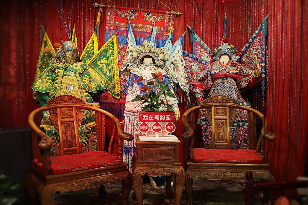 进窄巷子没多远我就被一家戏园吸引了,店名叫蜀韵园,他家外面穿传统戏曲服装的小姐姐很漂亮,我和朋友就这样被吸引进店了哈哈~戏院装修的很中式古典,一个一个的小方桌加太师椅,很有戏院喝茶看戏的氛围。
