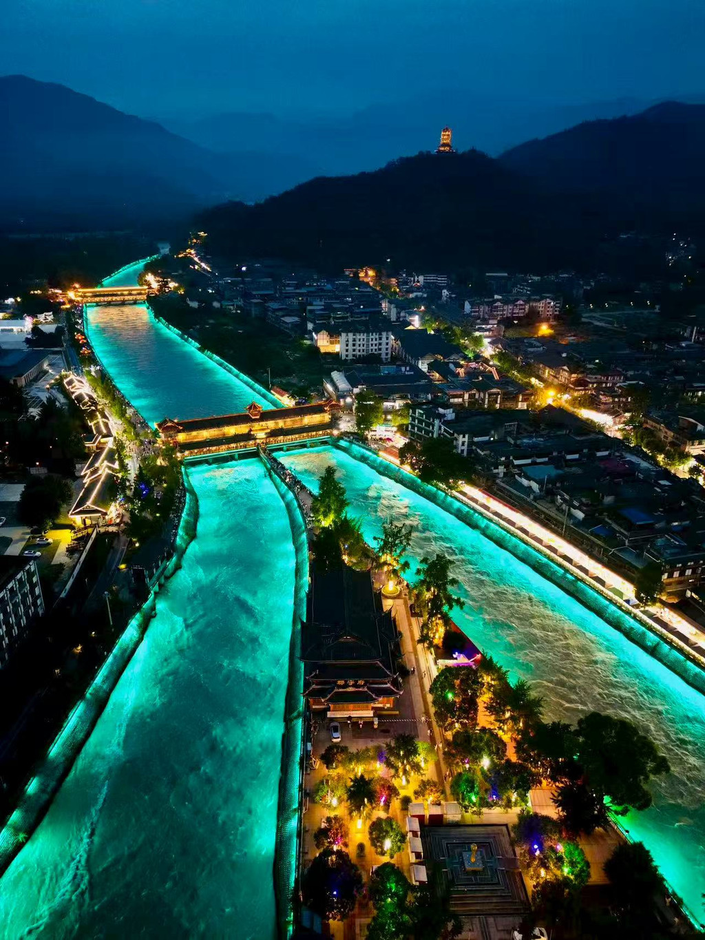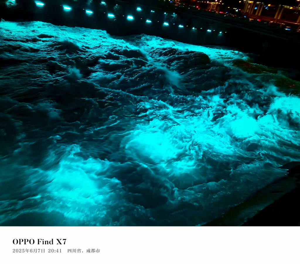 夜幕降临,南桥两边的灯亮起,照在奔涌而去的岷江之上,美轮美奂,这就是“蓝眼泪”。