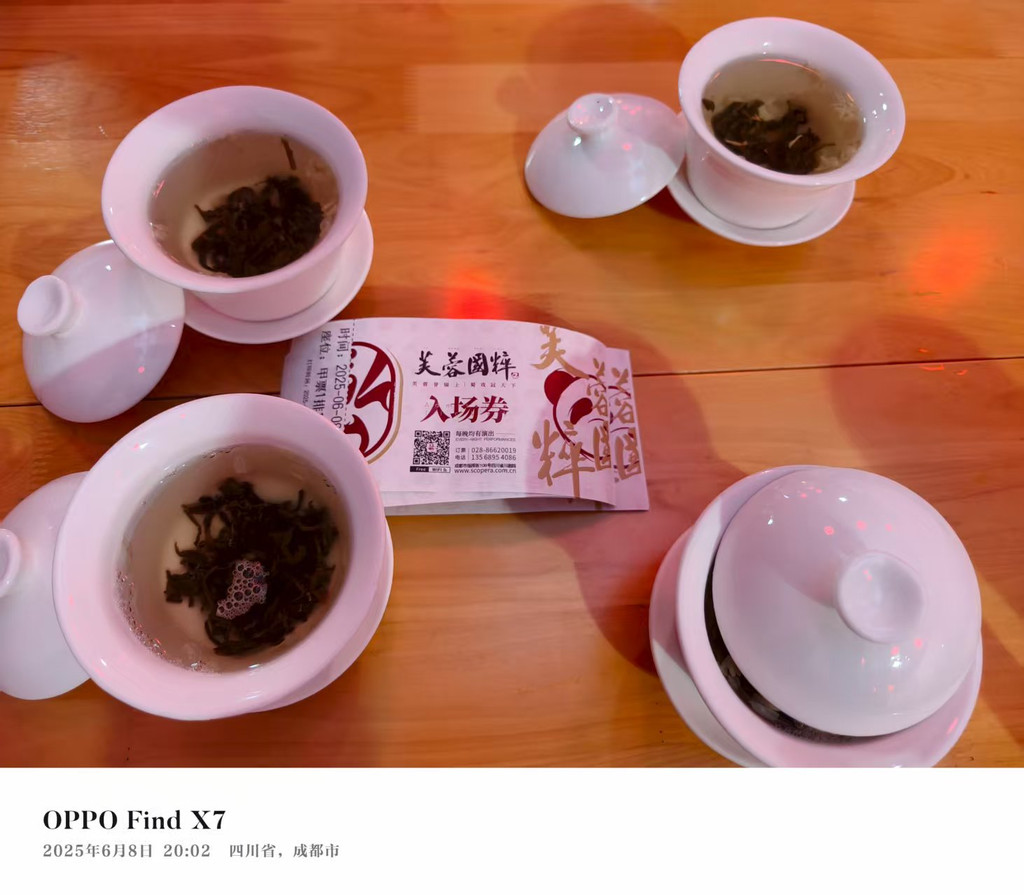 拿了票直接去负一楼喝茶,每张票送有免费的盖碗茶。盖碗茶是四川等地人民传统的饮茶风俗,为成都市的“正宗川味”特产,色香味形俱全。其中盖碗是一种上有盖、下有托,中有碗的茶具。省川剧院的盖碗茶是茉莉花茶,淡淡的茉莉香和绿茶的清香融合在一起。前三道工序直接省略,“闻香、程序品饮,用左手握住碗托,右手提碗抵盖,倾碗将茶汤徐徐送入口中”这第四、五道工序,我们还是做到了,哈哈哈。