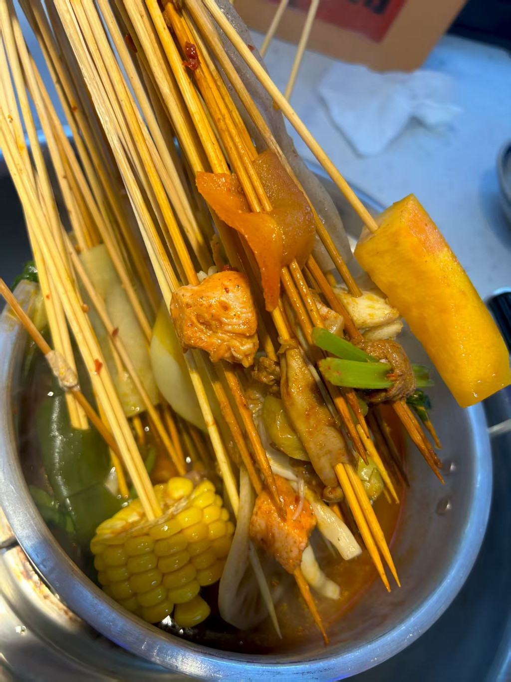 根据导游推荐又去了GG厂五区小郡肝串串香。点的微辣有点后悔,可以尝试下微微微辣。店里人很多,本地人聚餐的地方,一边热火朝天的聊天,一边热火朝天的吃串。我们点的是冷锅,第一次知道冷锅的概念。就是煮熟后直接放锅里端上来。