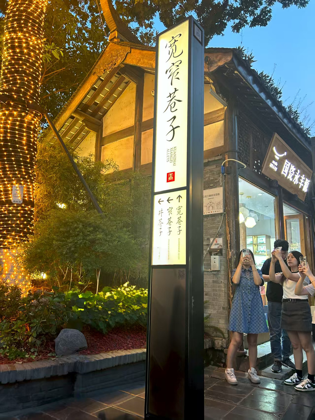 华灯初上,宽窄巷子就在眼前。入口处有很多卖熊猫元素商品的店,都挂着网红熊猫爷爷的牌子,和春熙路小店里的商品大同小异。宽窄巷子是一个宽巷子一个窄巷子,可以宽巷子走到头再岔到窄巷子上,不走回头路。宽巷子相对热闹,也是有很多卖熊猫元素商品的店,还有很多在古街里常见的小吃店、茶饮店、手工糖店。我们在一家店里品尝了免费的银耳羹,冰冰凉凉甜而不腻,非常适合成都的饭后。有特色的应该就是川剧变脸店吧,不过我们依然没看。