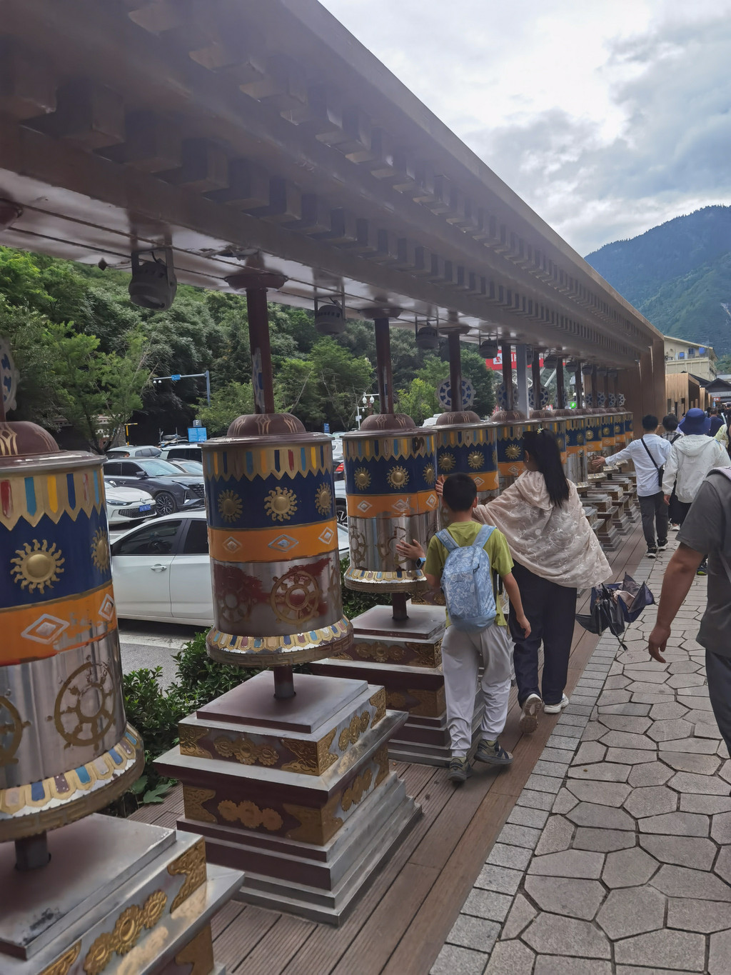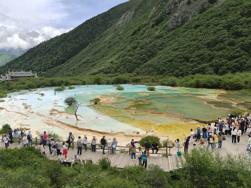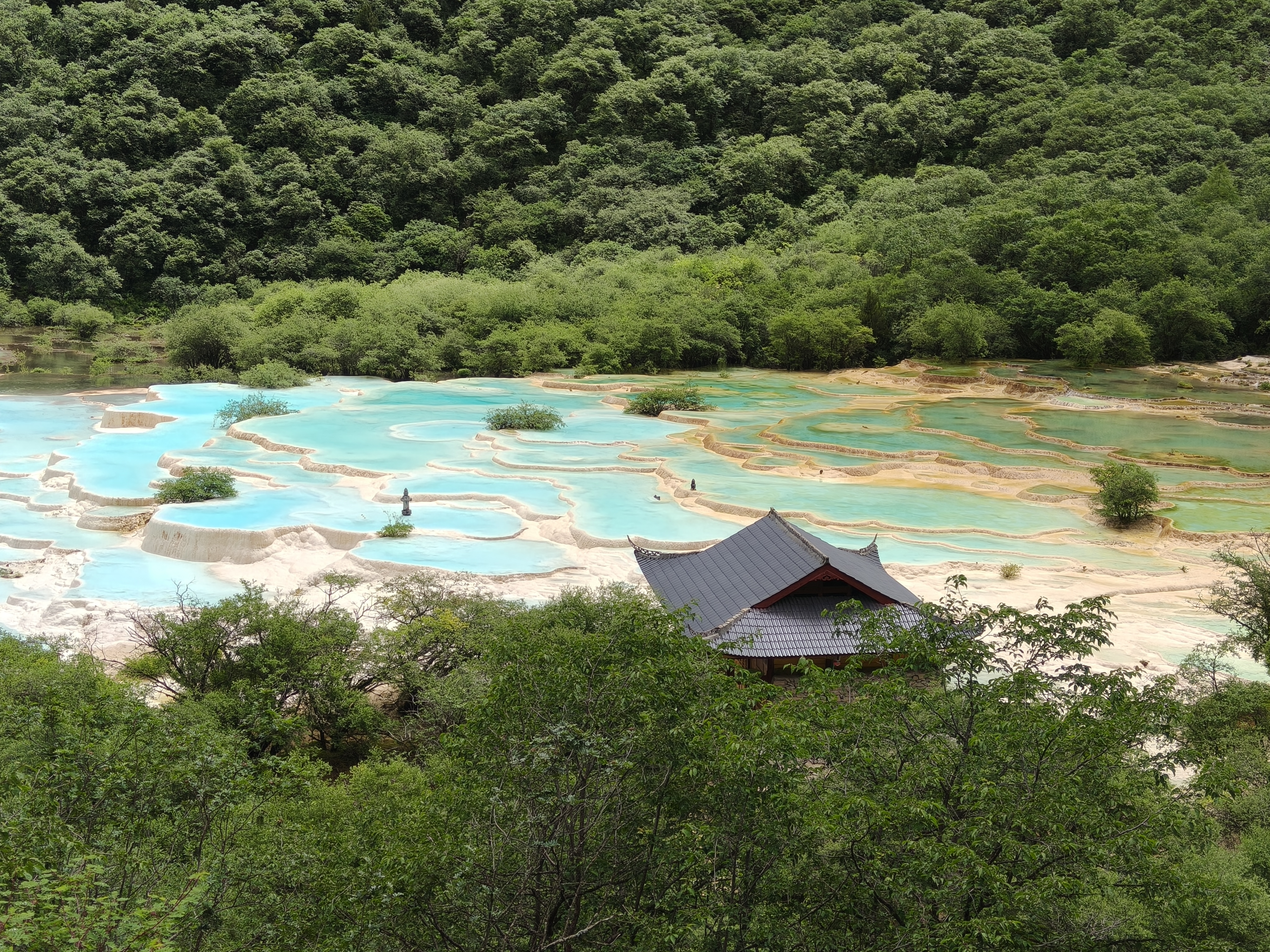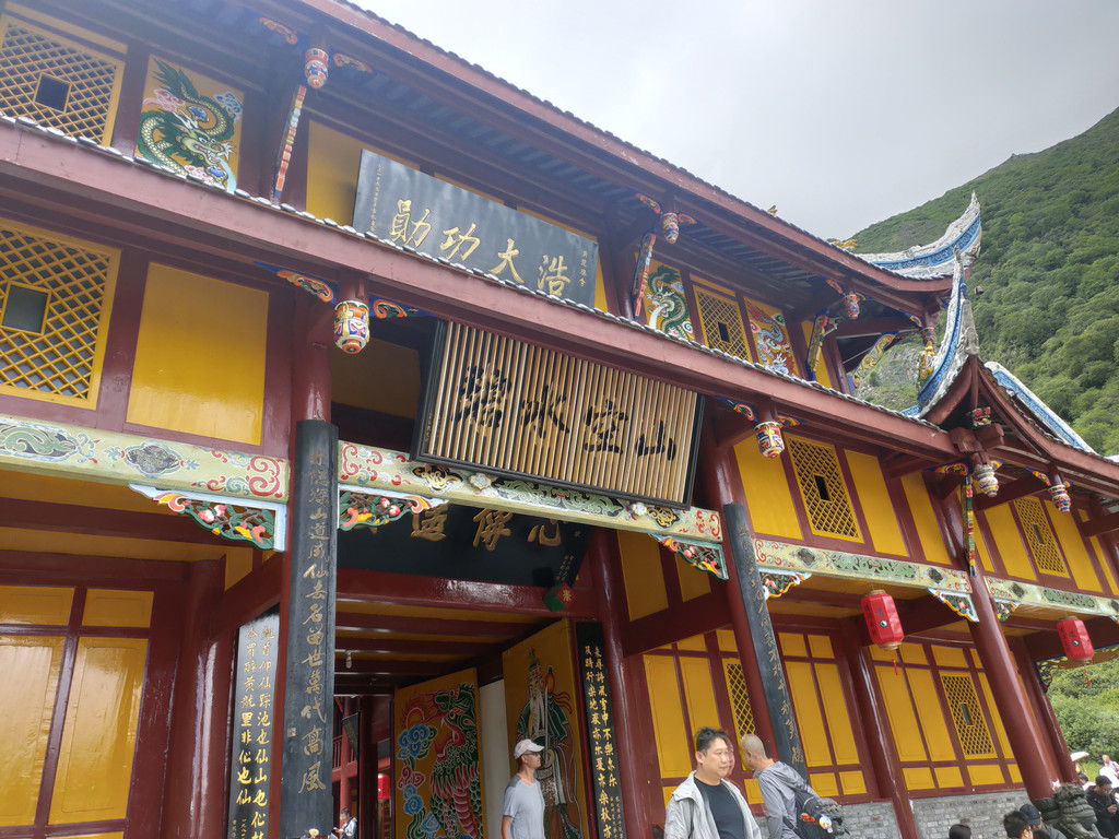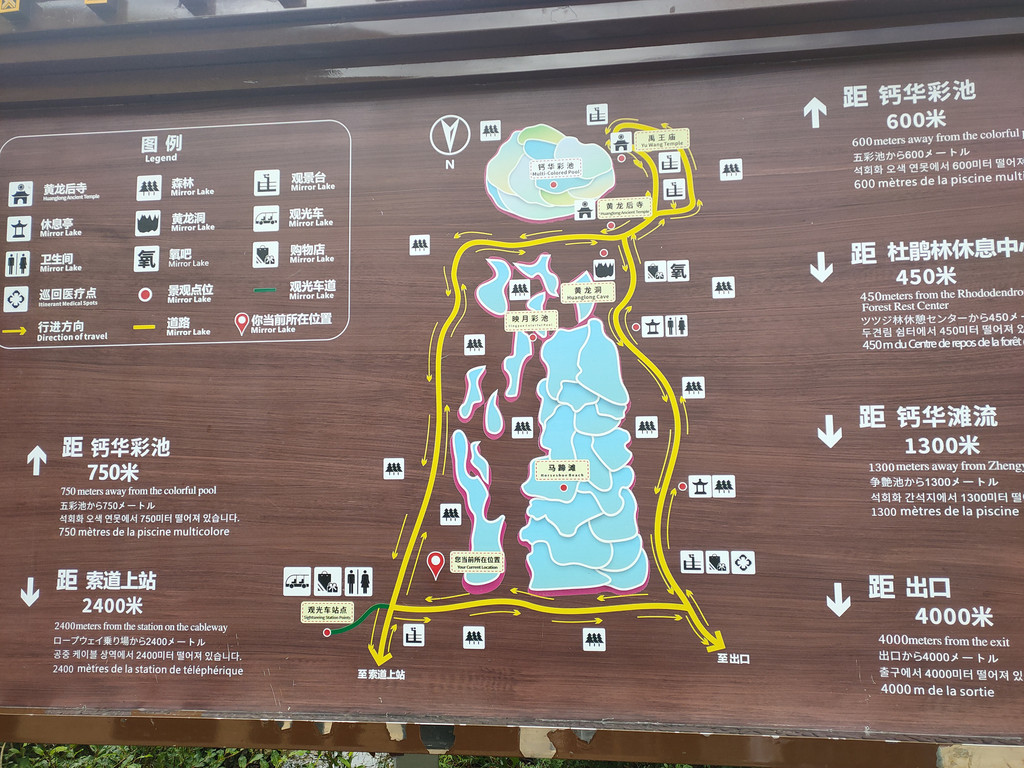 到山上之后可以坐观光车到达看五彩池的地方,但是需要提前四天在阿坝旅游小程序上购买观光车票(每日限售5000张),山顶是不现场购票的。我们没买到观光车票,所以在森林栈道上走了2400多米,才到达黄龙后寺,寺旁边就是通往五彩池的木栈道。