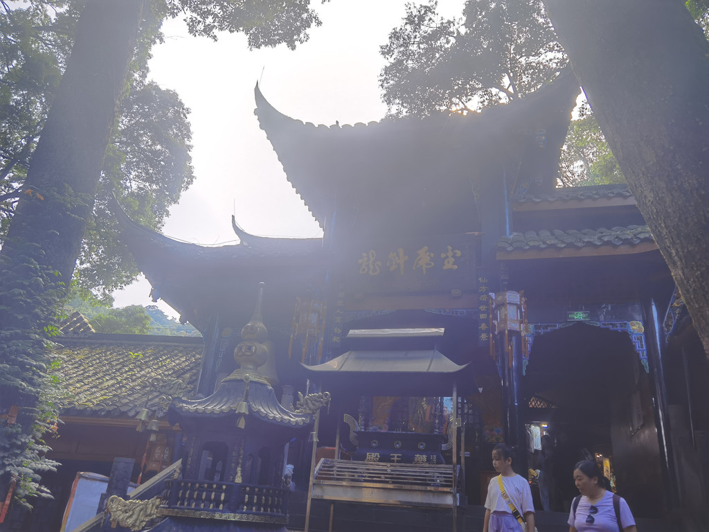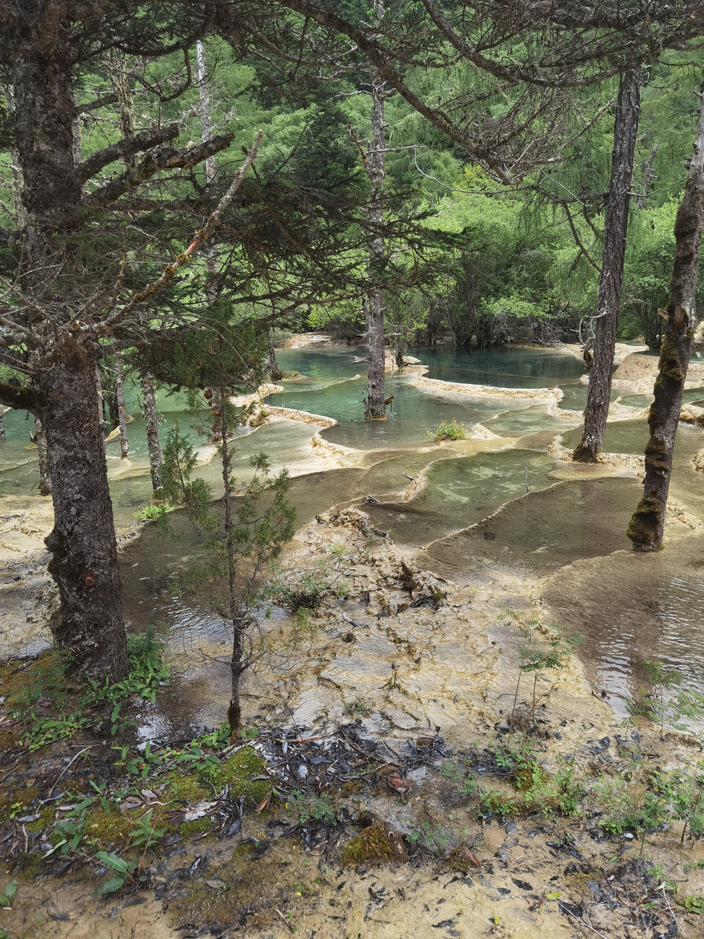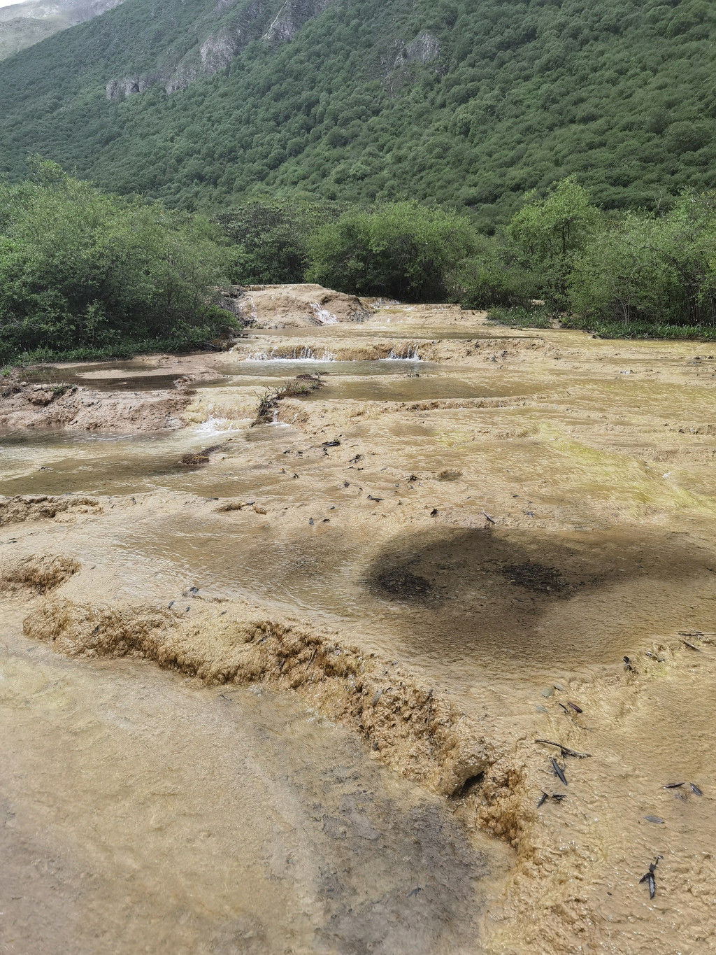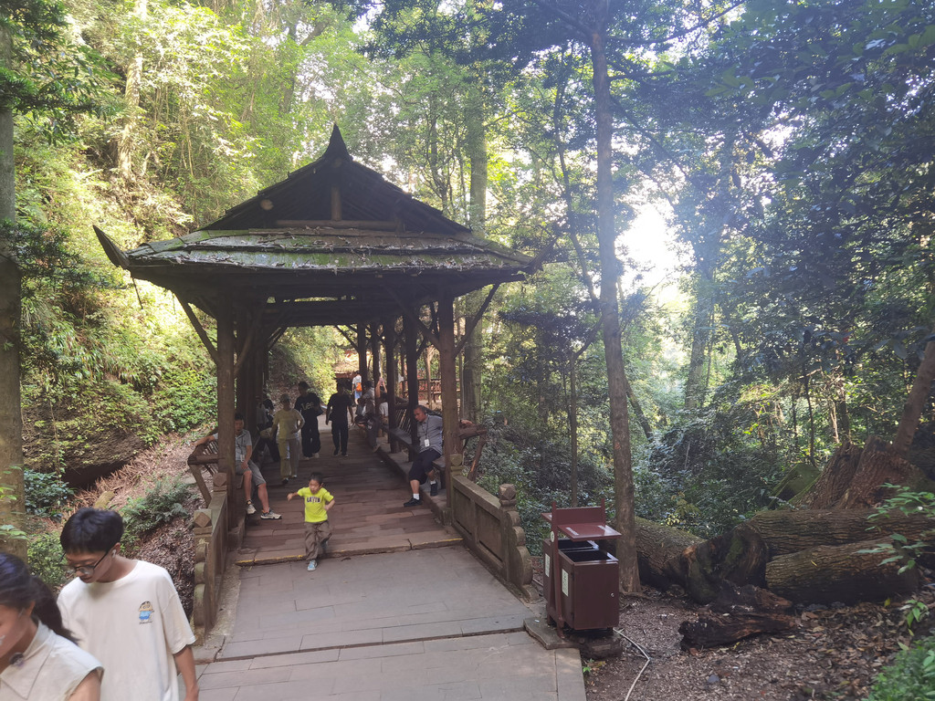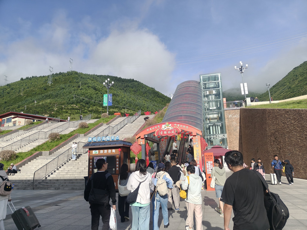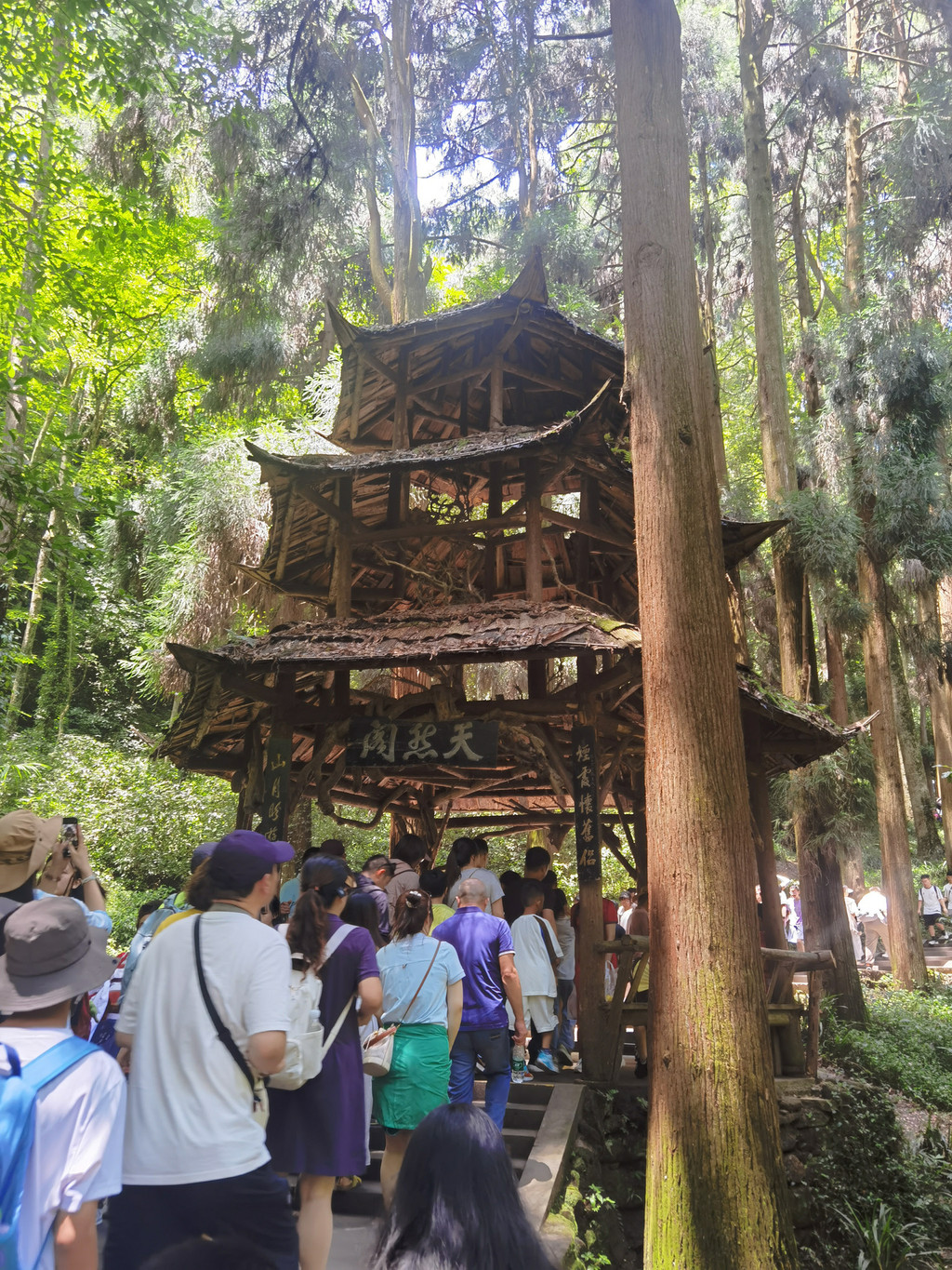 到山上之后可以坐观光车到达看五彩池的地方,但是需要提前四天在阿坝旅游小程序上购买观光车票(每日限售5000张),山顶是不现场购票的。我们没买到观光车票,所以在森林栈道上走了2400多米,才到达黄龙后寺,寺旁边就是通往五彩池的木栈道。