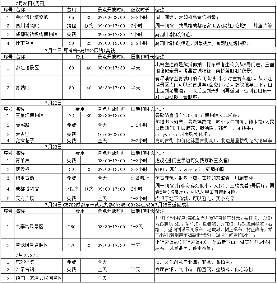 2025年夏天,终于来到了这个心心念念的旅游目的地——成都,因为担心夏天太热,原本是打算冬天来成都玩儿的,结果没能成行;到了暑假,还是决定到成都游玩,查询了近三年的天气,感觉成都在7月下旬高温天数还是不太多的,所以就决定这个时间出发(本次行程大多数日子的气温果然都在33度以下,比较舒适)。成都的大多数博物馆还算好约,但也需要提前预约,热门景区旁的住宿更是需要提前订好。下面是本次行程的攻略表格。
