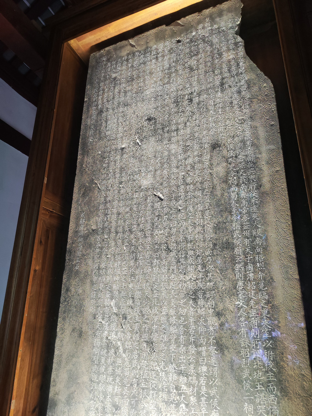 往里走首先看到的是明碑和唐碑。明碑是明代嘉靖年间(1547年)设立的碑刻文物,由四川巡抚张时彻撰文,成都府同知高登立碑,碑文包含序文和七言排律,记载武侯祠历史沿革及刘备生平。导游讲解说当年祭祀诸葛亮的祠堂并不是和祭祀刘备的祠堂在一起的,当年由于诸葛亮祠堂香火旺盛而刘备祠堂相对门庭冷落,才把诸葛亮祠堂给搬过来放在一起了。而唐碑又称“三绝碑”,立于唐元和四年(809年),由裴度撰文,名匠鲁建镌刻,通高3.67米,是国家一级文物。碑文赞颂诸葛亮功绩,柳公绰书法笔力雄健,与裴度文章、诸葛亮功绩合成“三绝”。