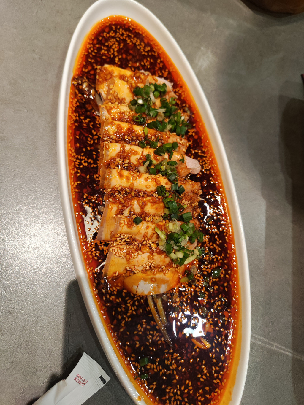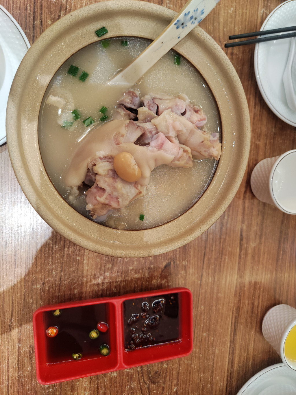 参观完熊猫基地,我们坐公交返回春熙路附近,随机找了一家“王婆婆老妈蹄花”吃晚饭,尽管才刚过5点,店里几乎满客了。我们点了蹄花、肥肠、拌面等,蹄花自然是很棒,它是在砂锅中煮的,白色的汤汁,里面点缀着葱花、大大的黄豆,味道十分鲜美。
