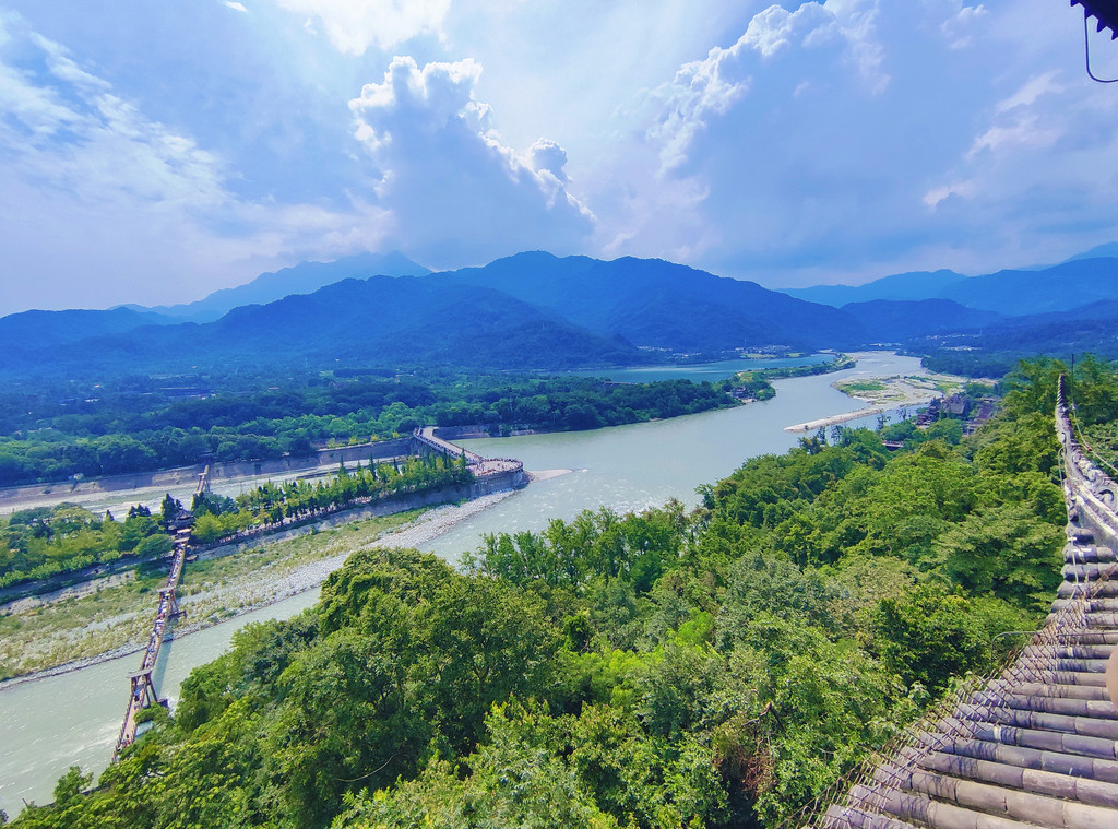 吃完午饭我们打车前往都江堰景区6号门,从这里进去是不走回头路的。刚下车就有人过来推荐讲解,我们顺便也就买了,价格是30元一人。都江堰是由渠首枢纽(鱼嘴、飞沙堰、宝瓶口)、灌区各级引水渠道,各类工程建筑物和大中小型水库和塘堰等构成的一个庞大工程系统,秦昭王后期蜀郡守李冰组织岷江两岸人民修建,是当今世界年代久远、唯一留存、以无坝引水为特征的宏大水利工程。我们首先随导游登上秦堰楼,到达最高层可以远眺都江堰三大水利工程、安澜桥、二王庙、古驿道、玉垒雄关、岷岭雪山、青城群峰尽收眼底,蔚为壮观,也是拍照宏大工程全景的绝佳场所。导游在这里对都江堰水利工程不同部分的功能进行了详细的讲解,“鱼嘴”是都江堰工程的核心,它将岷江水分为两股,也就是分为“外江”和“内江”,内江窄而深,外江宽而浅,加上弯道的存在,使得春耕时节六成江水流入内江,保证成都平原灌溉需求;洪水季节,只有四成江水流入内江,有效解决了防洪问题。李冰利用河床高度差和弯道等自然条件实现江水的合理分配,体现了古人与自然和谐共处之理念。此外,“鱼嘴”还具有排沙排石的功能,它利用弯道环流原理,将大部分沙石排向外江,减少了内江堵塞的风险。